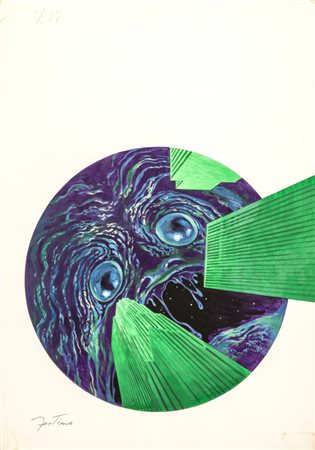Giuseppe Festino "Classici Urania - Atterraggio Proibito", 1985 china e tempera su cartoncino, 25,5 x 36,5 cm Originale di copertina per "Atterraggio Proibito" di John Brunner, edito nella collana Classici Urania al n.105 da Mondadori nel 1985. Festino è da annoverare, insieme ai grandi maestri come Thole e Jacono, tra coloro che resero celebre la testata fantascientifica della Mondadori grazie alla realizzazione di copertine di notevole impatto e impareggiabile innovazione stilistica. Firmata.