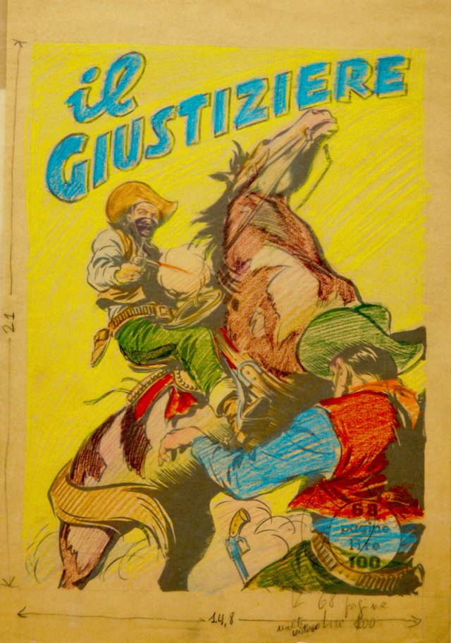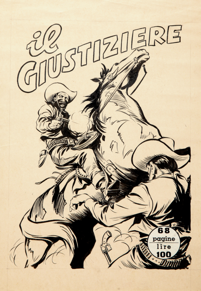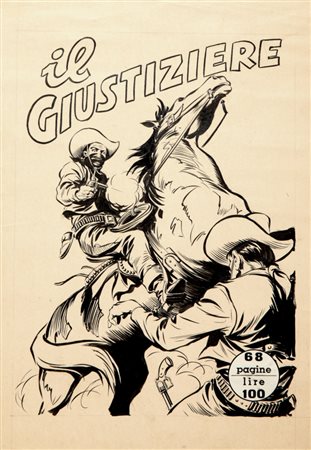 Aurelio Galleppini "Il Giustiziere", 1950 matita e china su cartoncino, 25 x 36 cm Originale di copertina per "Il giustiziere", edito nella colana "Il ragno d'oro" al n.5 dalla casa editrice Audace nel 1950. In questa serie composta da otto numeri, di difficilissima reperibilità, Galleppini si occupò di realizzare le copertine degli ultimi cinque volumi. Copertina di forte impatto e assoluta iconograficità. Testi di G.L. Bonelli. Si allega la prova colore a pastello su lucido.