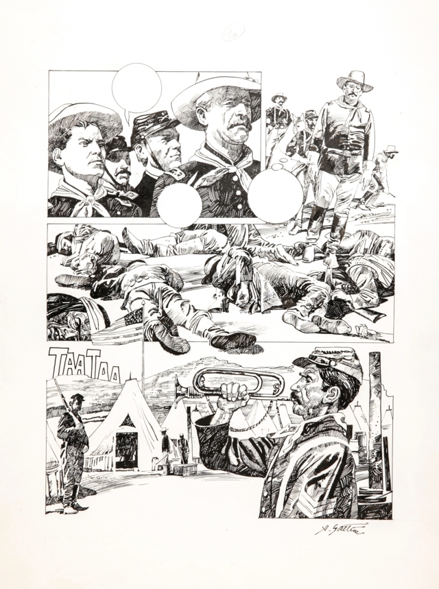 Alarico Gattia "Les Tuniques Bleues", 1980 matita e china su cartoncino, 35,5 x 51 cm Tavola originale edita sulla collana francese "Histoire du Far West" nell'albo n.17 dal titolo "Les Tuniques Bleues" edizioni Larousse 1980. Firmata.
