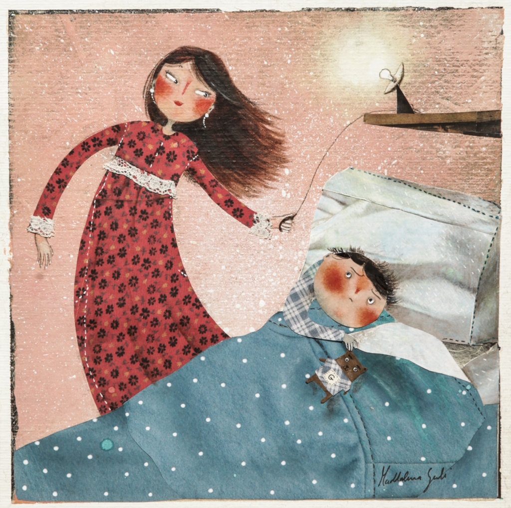 Maddalena Gerli "Mamma ho paura del buio", 2011 acrilici e collage su cartoncino, 22 x 22 cm Illustrazione originale realizzata dalla Gerli per il porfolio "...con un filo di lana" edito da Spazio Papel nel 2011. Titolata al retro. Firmata.
