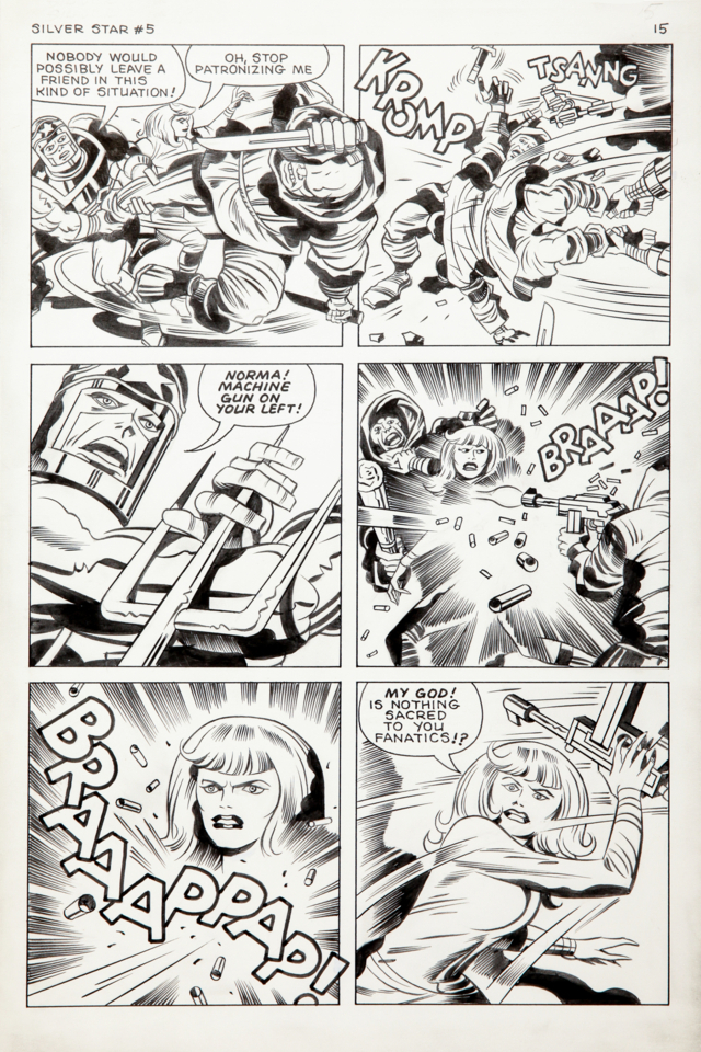 Jack Kirby "Silver Star", 1983 matita e china su cartoncino, 28 x 43 cm Tavola originale realizzata da Kirby per la miniserie "Silver Star", edita a pag.15 del n.5 dalla Pacific Comics nel 1983. Chine di D. Bruce Berry.