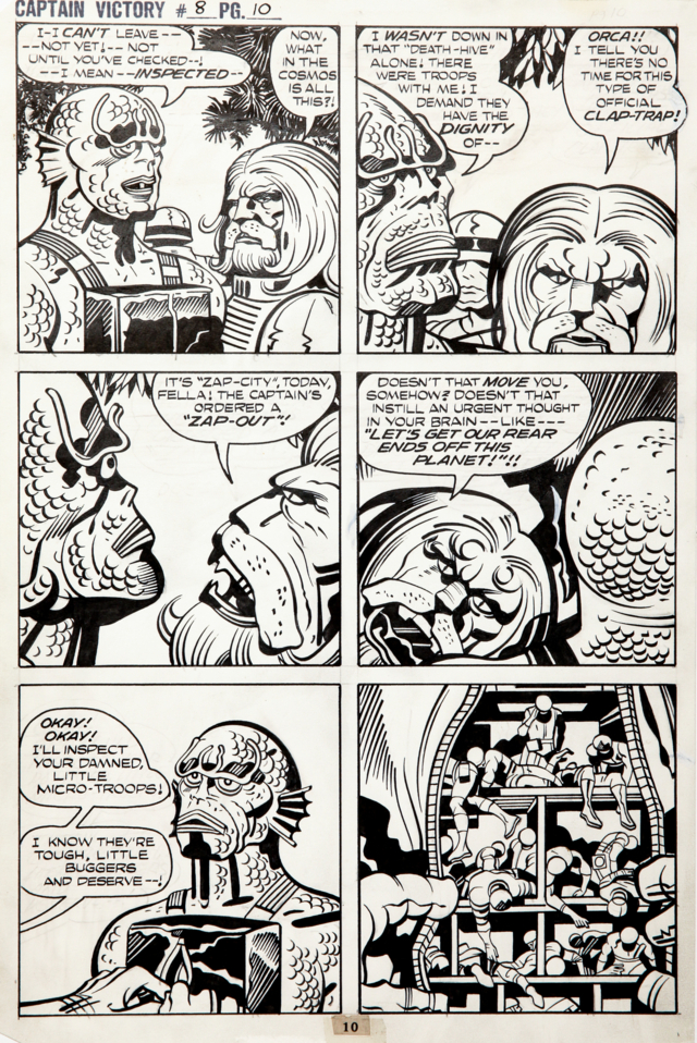 Jack Kirby "Captain Victory and the Galactic Rangers", 1982 matita e china su cartoncino, 26,5 x 40,5 cm Tavola originale realizzata da Kirby per la miniserie "Captain Victory and the Galactic Rangers", edita a pag.10 del n.8 dalla Pacific Comics nel 1982. Chine di Mike Thibodeaux.