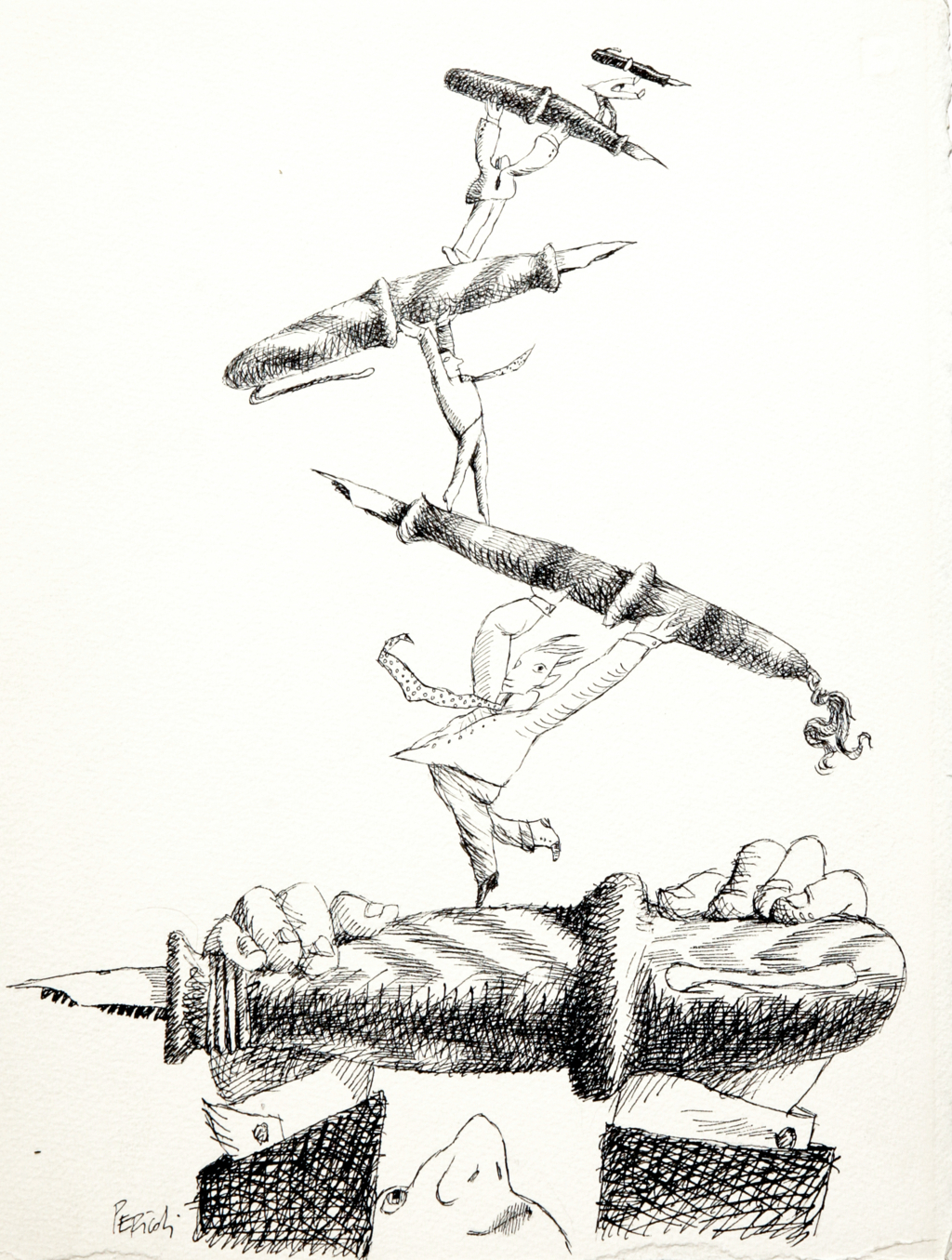 Tullio Pericoli "Penne in equilibrio", 1991 china su cartoncino, 28 x 38 cm Illustrazione originale edita per la prima volta sulla sulla Pagina della Cultura de La Repubblica il 29/06/1991. Caposaldo della cultura grafica italiana, Pericoli riesce con il suo stile unico ed elegante a racchiudere un concetto o addirittura un intero libro in una sola immagine. Firmata.