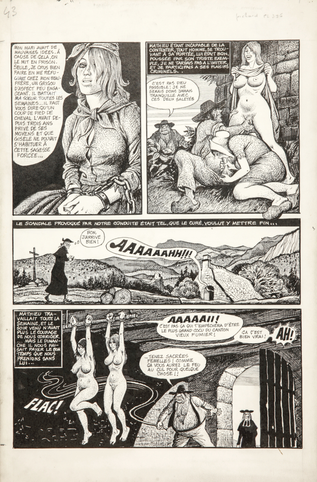 George Pichard "Marie-Gabrielle de Saint-Eutrope", 1977 matita e china su cartoncino, 32,5 x 50 cm Tavola originale per il volume "Marie-Gabrielle de Saint-Eutrope" edita a pag. 47 dalla casa editrice francese Glénat nel 1977. La carica erotica sadomasochista del maestro francese è al suo apice in questa bellissima tavola.