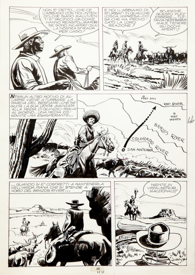 Renato Polese "Storia del West - Abilene", 1972 matita e china su cartoncino, 28 x 43 cm Tavola originale per "Abilene" edita per la prima volta sulla Collana Rodeo n.67 nel '72 e successivamente a pag. 46 su Storia del West n.32 dalla Bonelli nel 1987.