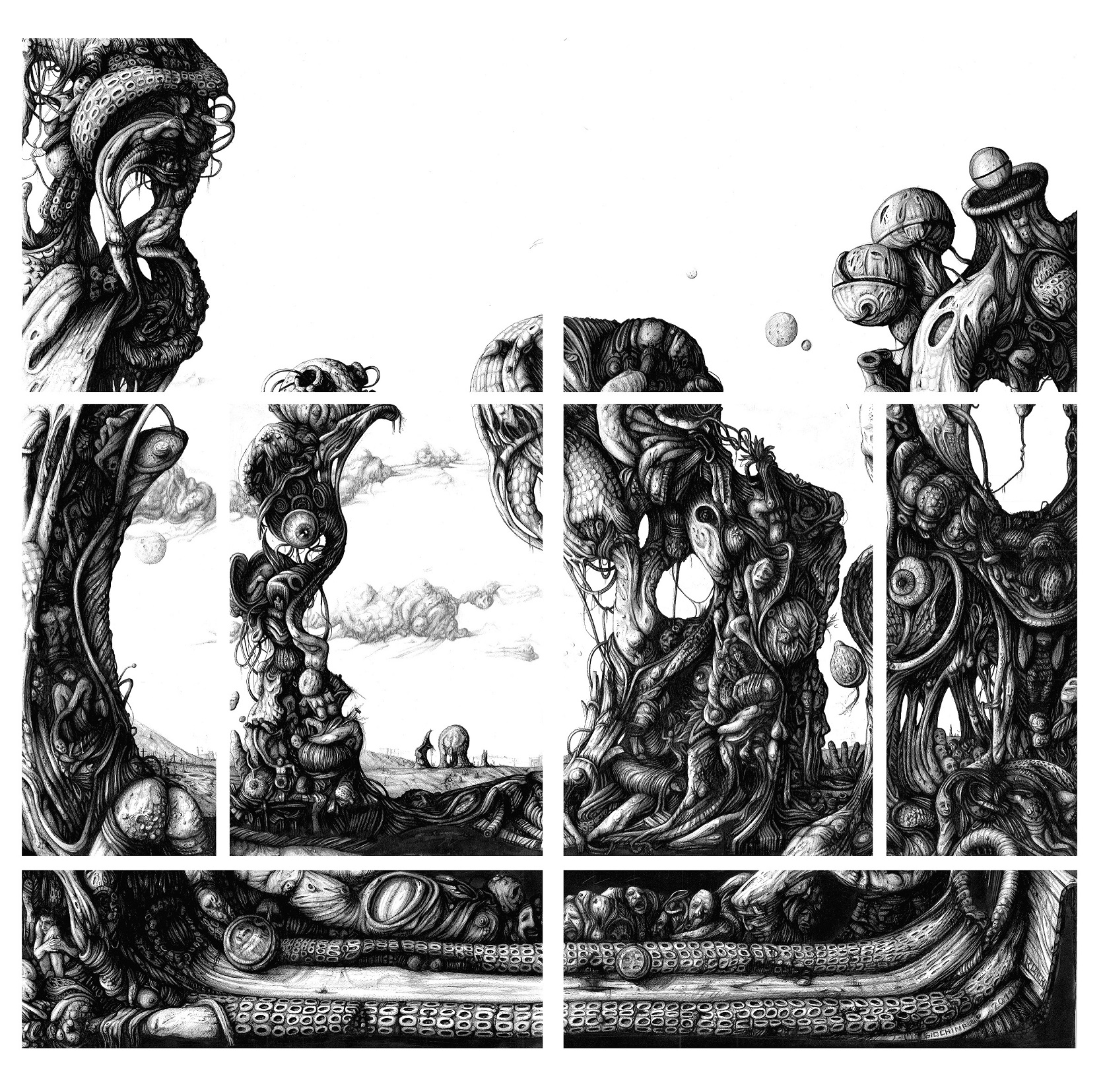 Stefano Ronchi "Giochi di ruolo", 2011 matita, penna e china su cartoncino, 100 x 100 cm Illustrazione originale (composta da più fogli) titolata "Giochi di ruolo" e realizzata da Ronchi in occasione della mostra "Secret Places" tenutasi a Milano nel 2011. Artista di incredibile capacità tecnica e compositiva, Ronchi riesce a spaziare tra diverse tecniche e supporti attraverso un approccio miniaturista, rappresentando contesti urbani oniricamente smembrati in un brulichio di architetture e di forme traendo ispirazione dai grandi maestri del passato come Bosch, Brueghel, Dalì e Giger. Firmata e titolata. In cornice.