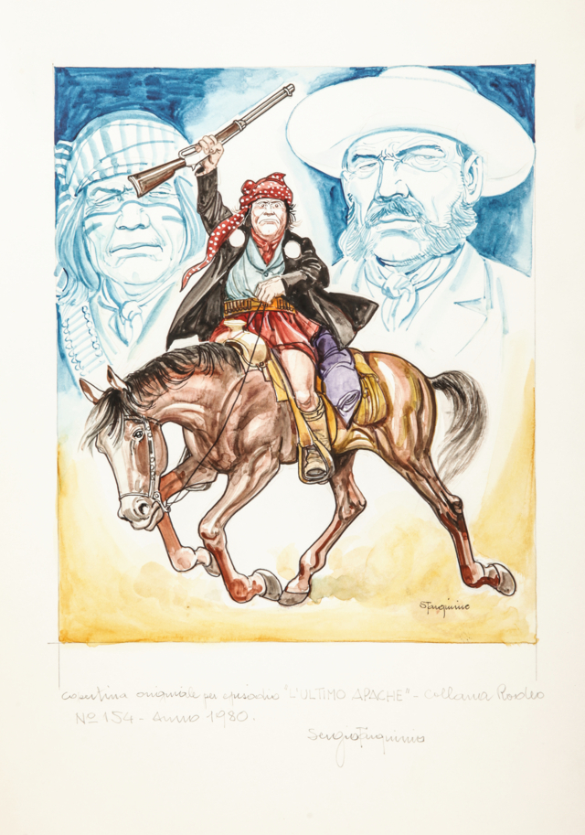 Sergio Tarquinio "Storia del West - L'ultimo apache", 1980 matita e acquerello su cartoncino, 35 x 50 cm Originale di copertina non utilizzato per la storia "L'ultimo apache" edita nella collana Storia del West n.154 dalla Cepim nel 1980. Firmata e titolata.