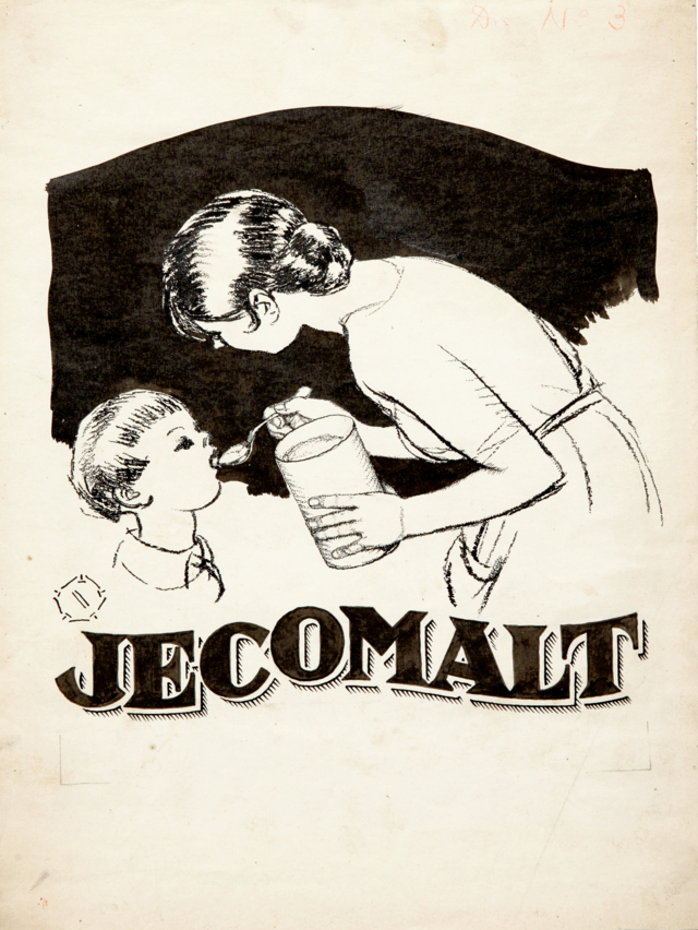 Aleardo Terzi "Jecomalt", anni '30 china su cartoncino, 27,5 x 36,5 cm Illustrazione pubblicitaria ralizzata da Terzi per l'olio di fegato di merluzzo Jecomalt. Firmata.
