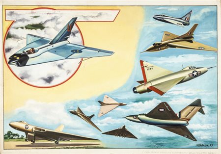 Nevio Zeccara "L'ala a delta", 1953 tempera su cartone, 50 x 35,5 cm Illustrazione originale per il paginone centrale de Il Vittorioso n.26 anno XVII edita a pag. 8 e 9 nel 1953. In questo numero de Il Vittorioso Zeccara illustra un interessante articolo sull'utilizzo dell'ala a delta nei nuovi veivoli da combattimento. Famoso soprattutto per le sue storie d'aviazione, Zeccara ha pubblicato i suoi lavori in molti paesi esteri tra cui l'Inghilterra e la Francia. Firmata e datata.
