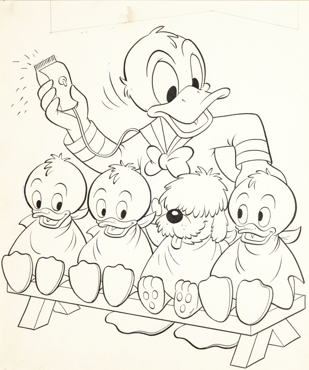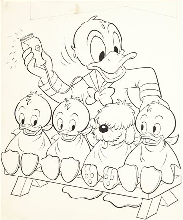 Pete Alvarado "Walt Disney's Comics and Stories", 1974 matita e china su cartoncino, 26 x 30,5 cm Originale di copertina realizzato da Alvarado per Walt Disney's Comics and Stories n. 404 edito dalla Disney nel 1974. La presente copertina sarà riutilizzata svariate volte negli anni successivi, in Italia fu infatti ripresa e modificata da Marco Rota per Topolino n. 1038 nel 1975. In cornice.
