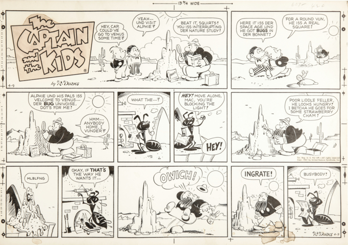 Rudolph Dirks "The Captain and the Kids", 1961 matita e china su cartoncino, 59,5 x 42 cm Tavola domenicale del 09/04/1961 per The Captain and the Kids. In questa splendida domenicale Dirks sembra voler rendere un affettuoso e divertente omaggio al fratello Gus, creatore molti decenni prima del piccolo mondo di "Bugville" e scomparso prematuramente. Firmata.