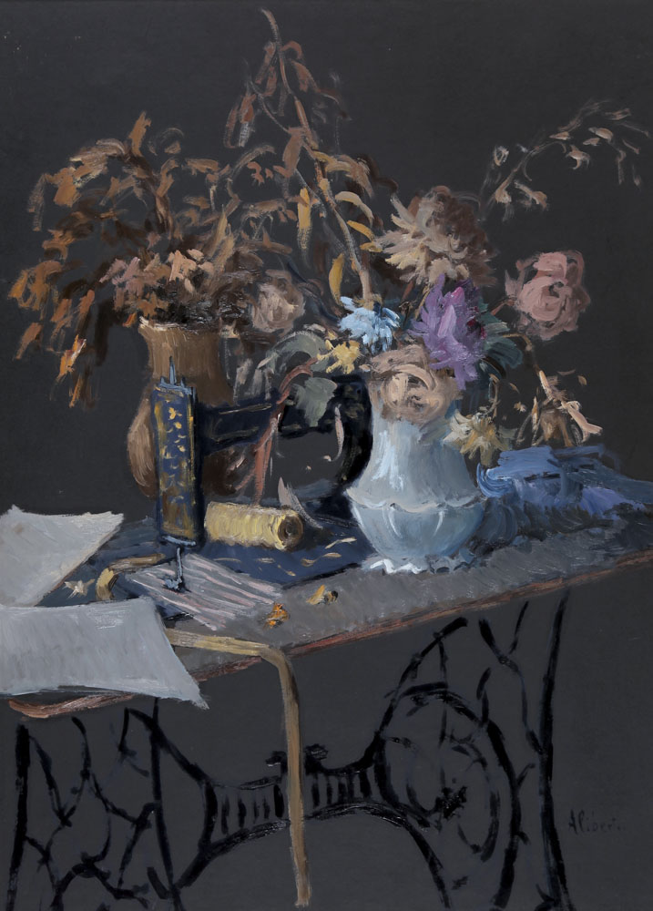 ALIBERTI DINO Torino 21/02/1935Fiori e vecchia macchina da cucireolio su...