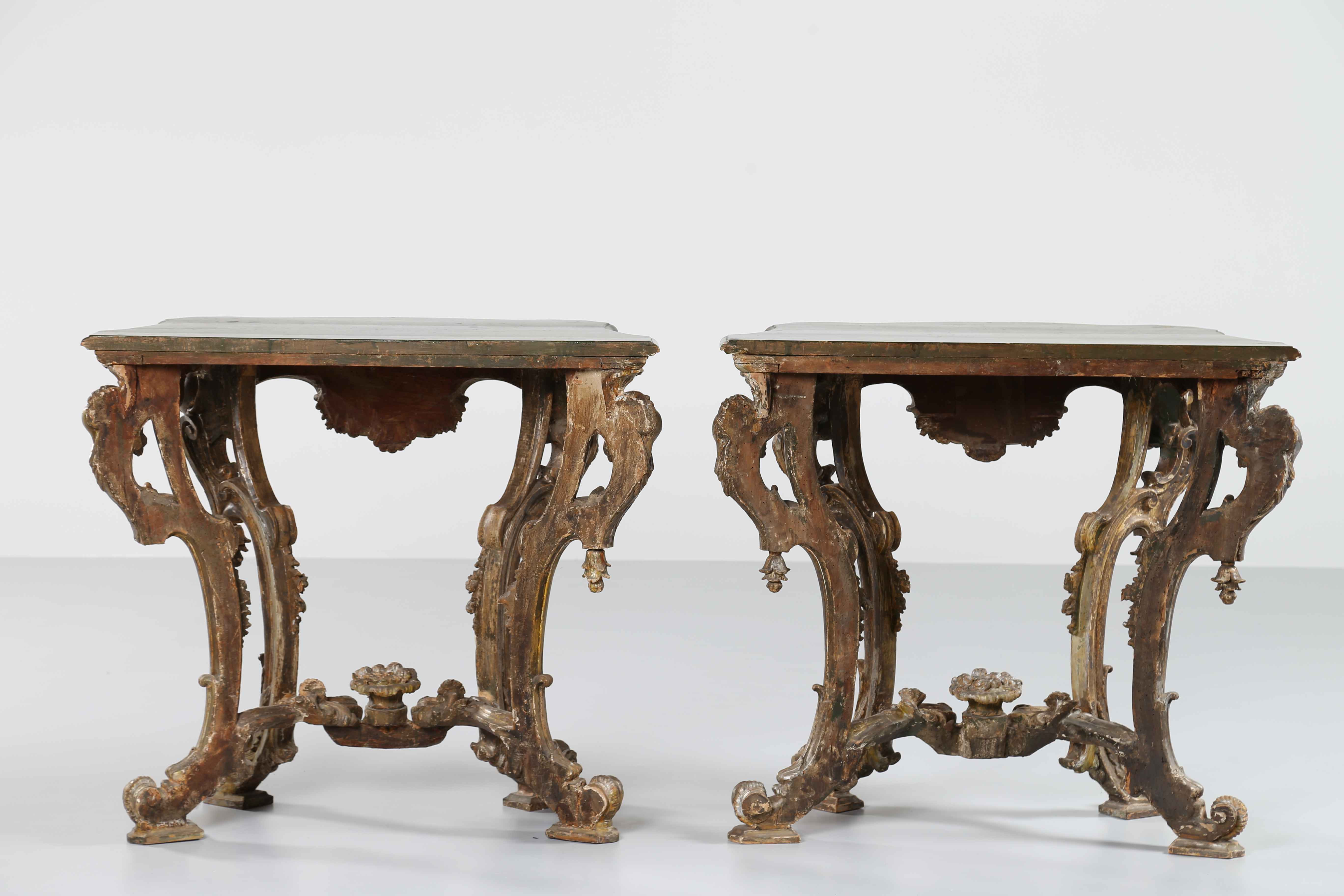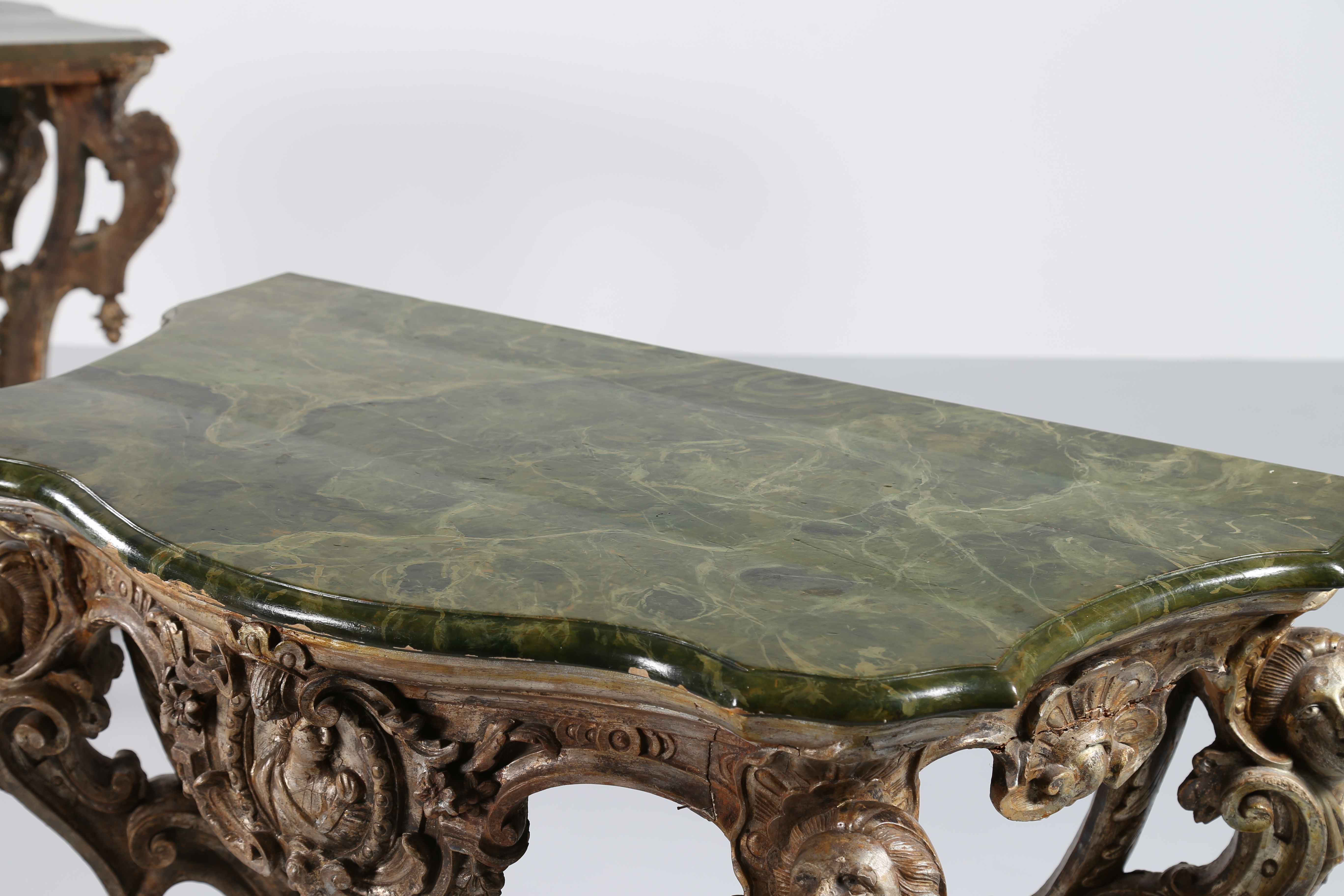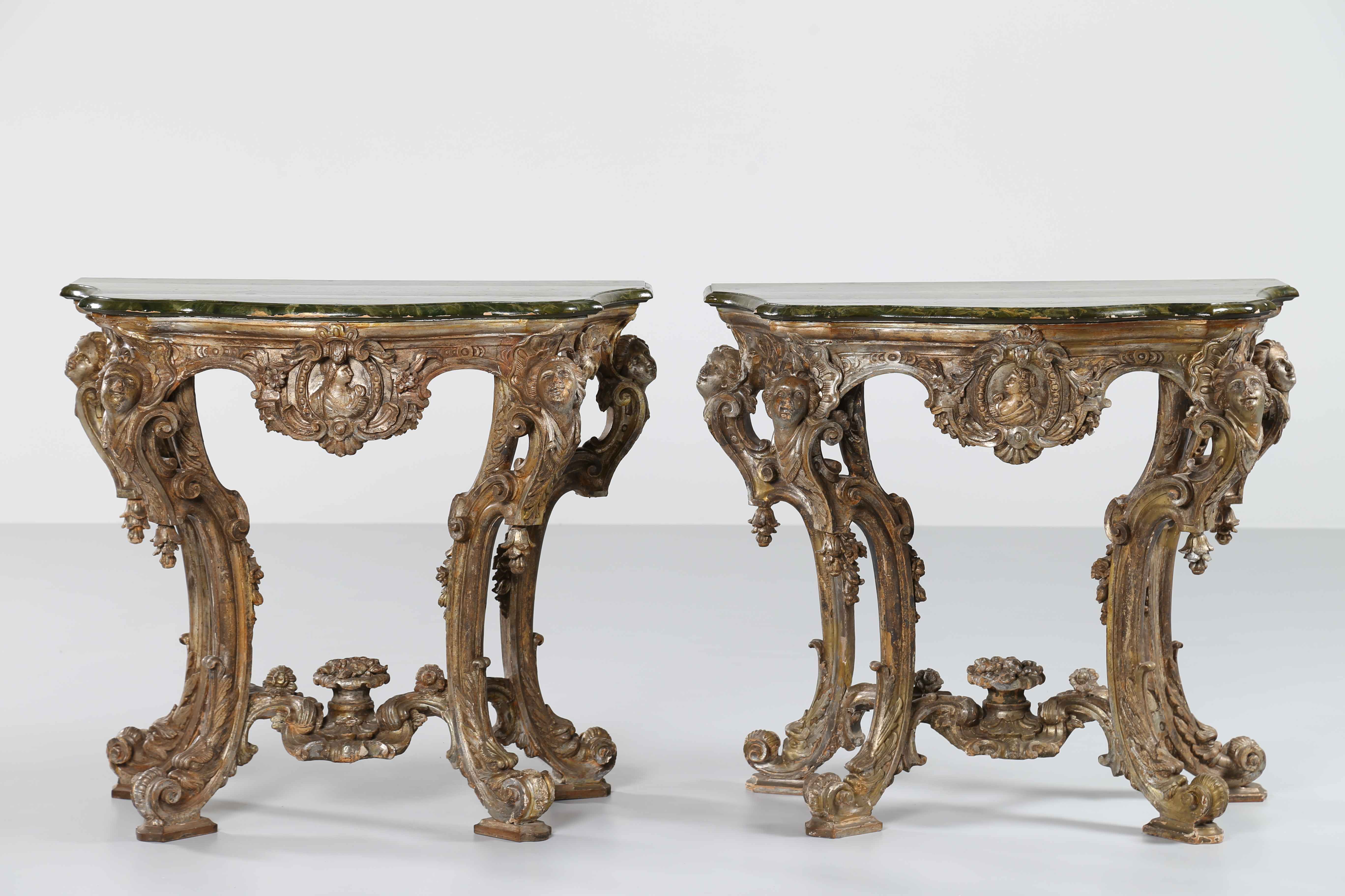 MANIFATTURA FRANCESE DEL XVIII SECOLO Elegante coppia di consoles con mascheroni laterali, finemente intagliate e dorate. Legno dorato. . Periodo Luigi XV-Luigi XVI. Piano sagomato posteriore. Presenti sbeccature e difetti. XVII CENTURY FRENCH MANUFACTURE Elegant pair of consoles with grotesque masks on the side, finely carved and gilded. Wood Louis XV-Louis XVI Period. Shaped rear top. Some chipping and defects.