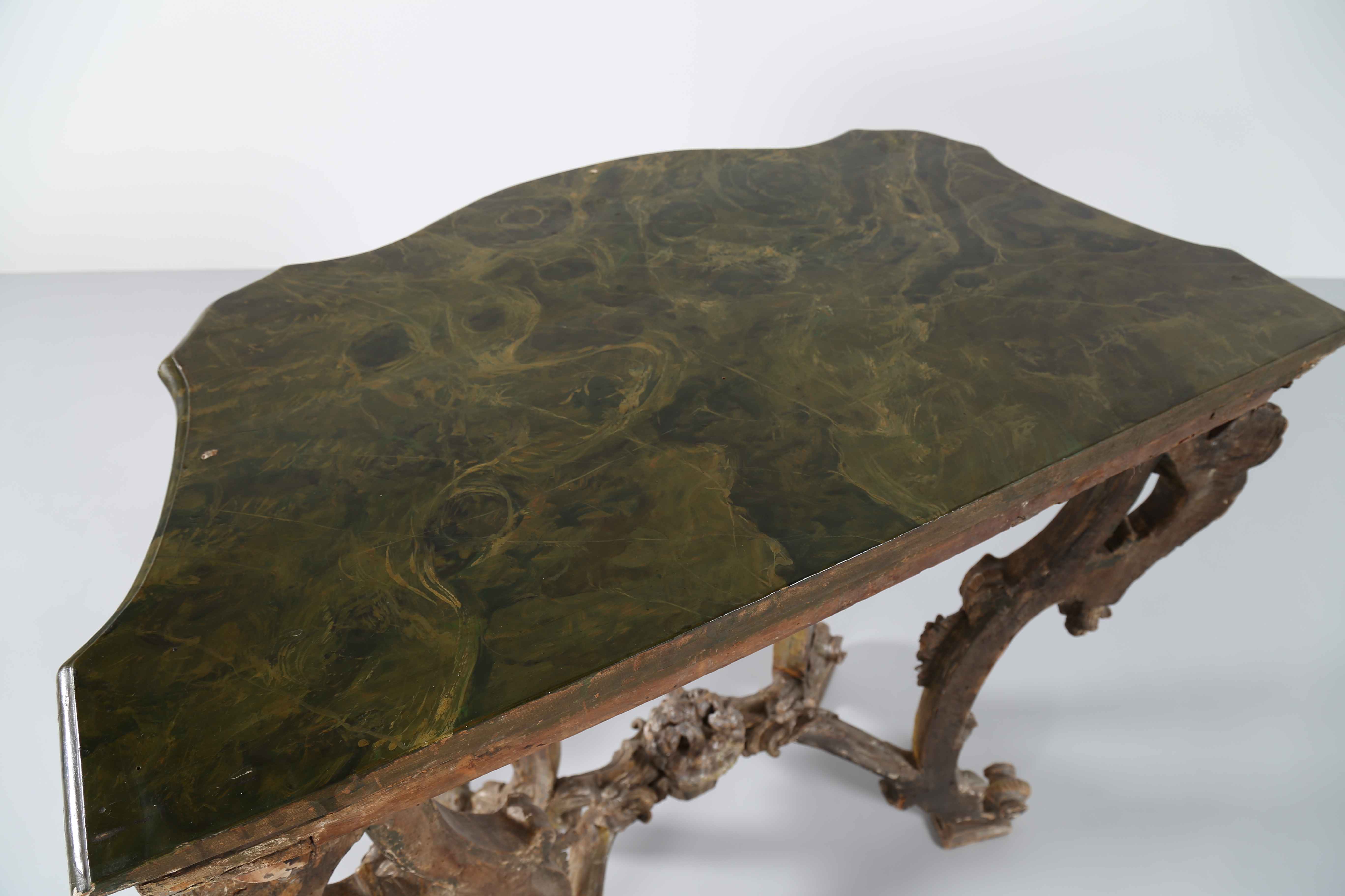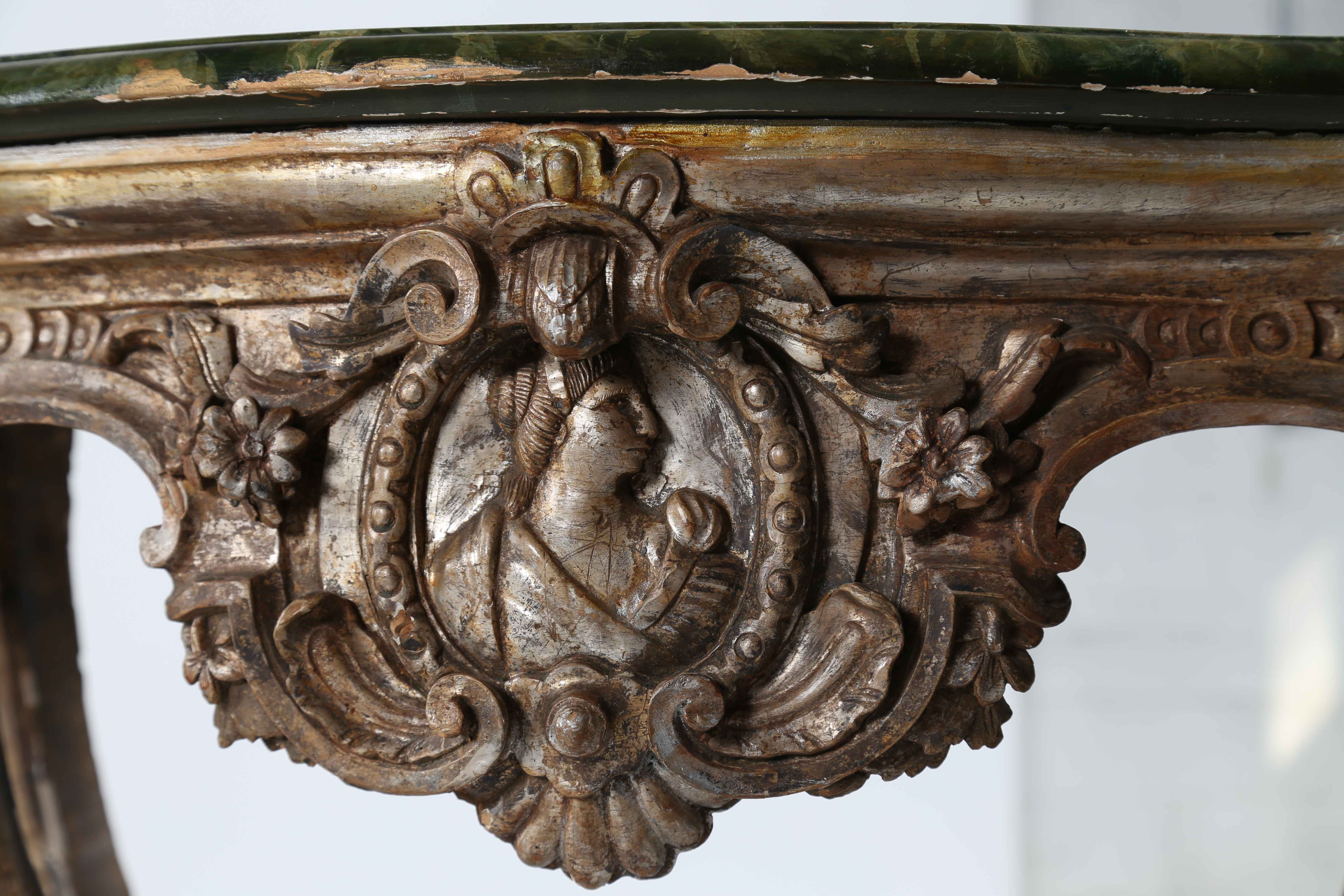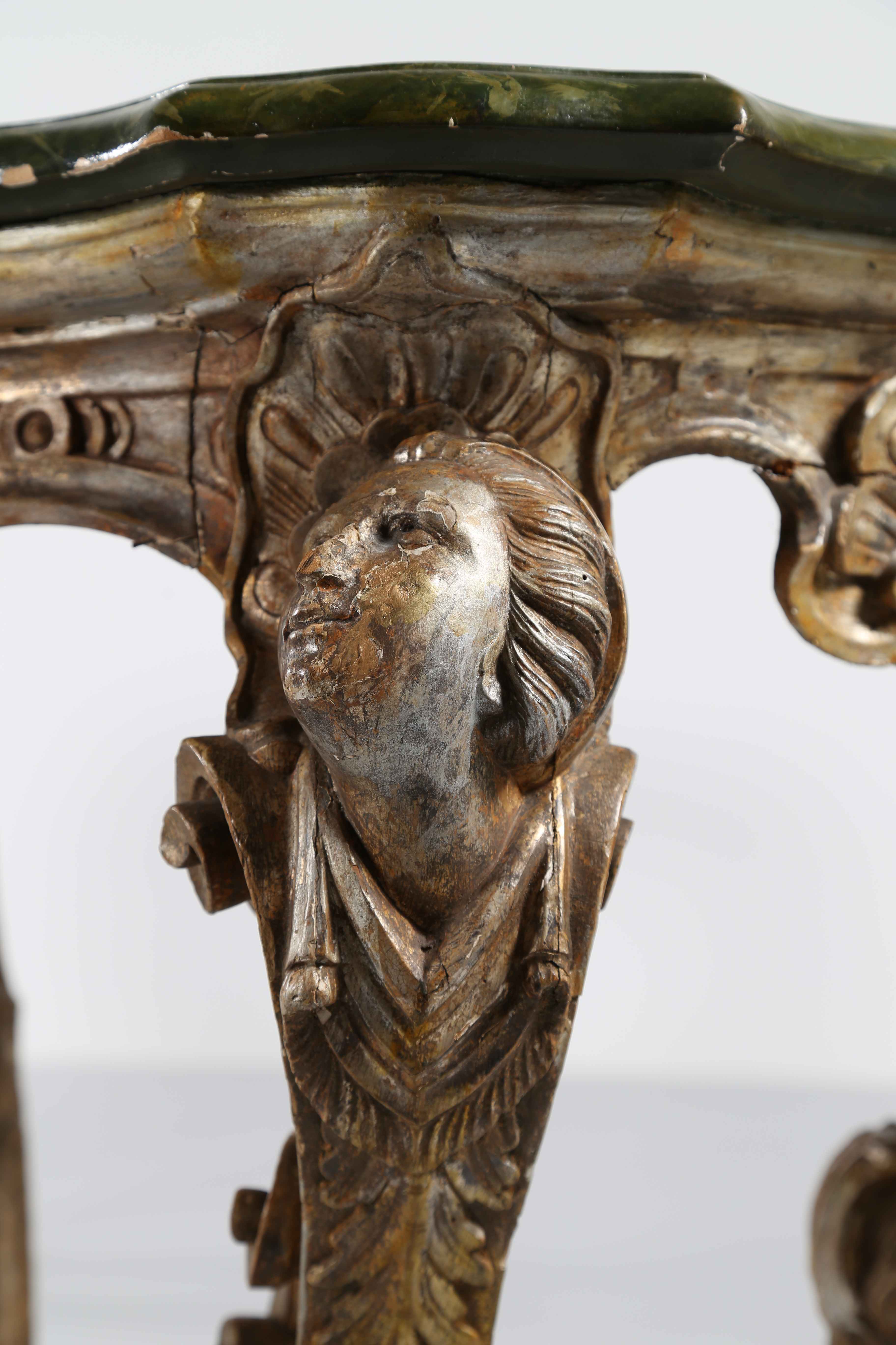 MANIFATTURA FRANCESE DEL XVIII SECOLO Elegante coppia di consoles con mascheroni laterali, finemente intagliate e dorate. Legno dorato. . Periodo Luigi XV-Luigi XVI. Piano sagomato posteriore. Presenti sbeccature e difetti. XVII CENTURY FRENCH MANUFACTURE Elegant pair of consoles with grotesque masks on the side, finely carved and gilded. Wood Louis XV-Louis XVI Period. Shaped rear top. Some chipping and defects.