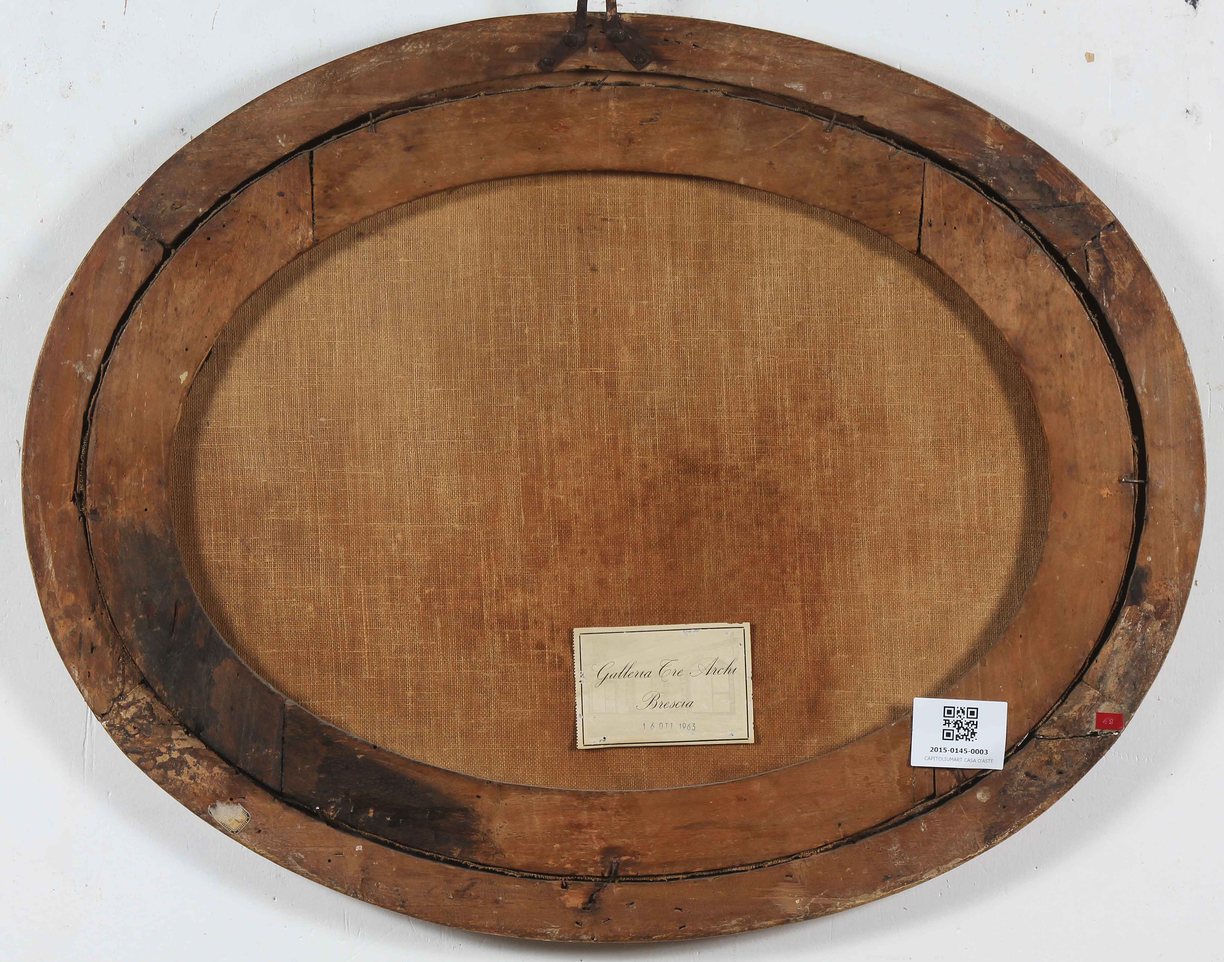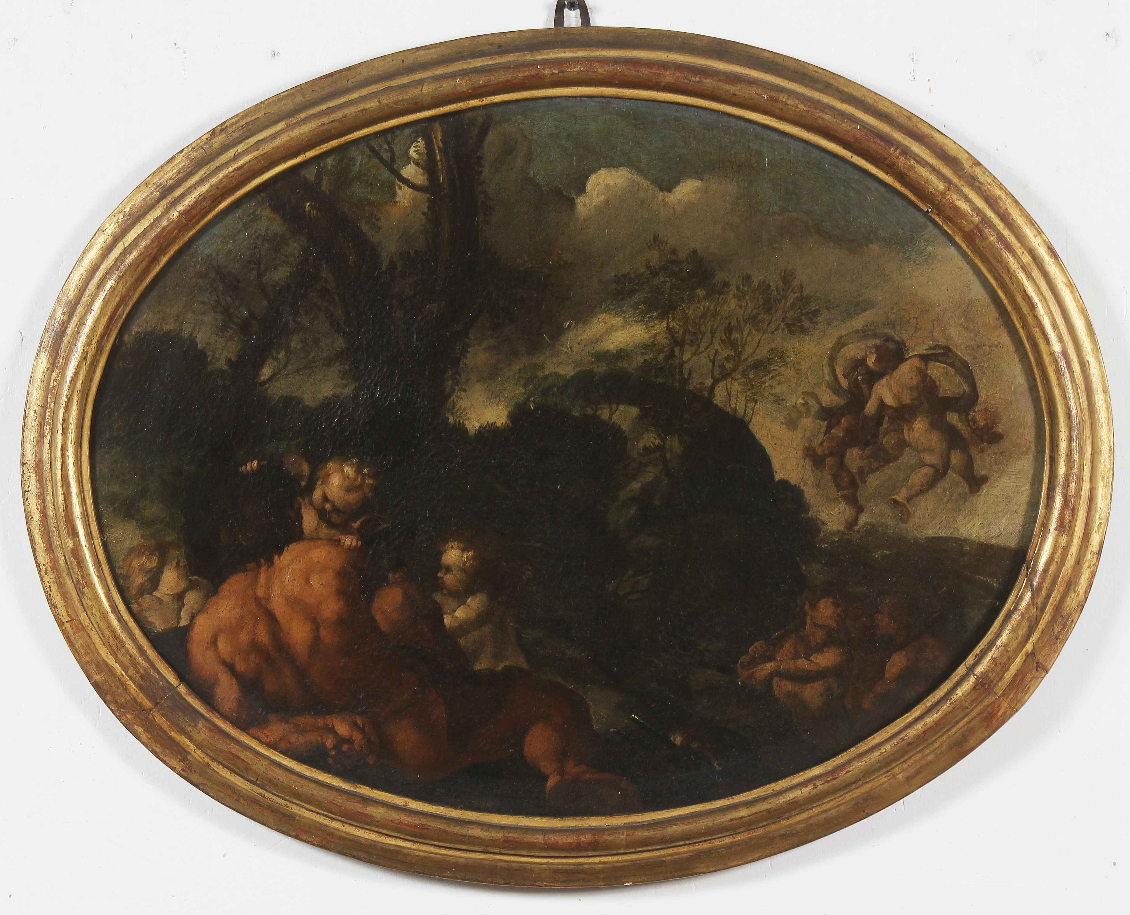 ARTISTA ROMANO DEL XVII SECOLO Personaggi in un paesaggio. Olio su tela . Cm 60,00 x 45,00. Al retro cartiglio della Galleria Tre Archi, Brescia 1963. ROMAN ARTIST XVII CENTURY Characters in a landscape. Oil on canvas "Cartouche of the Galleria Tre Archi, Brescia 1963 on the back. 60,00 x 45,00 cm. . Cornice presente