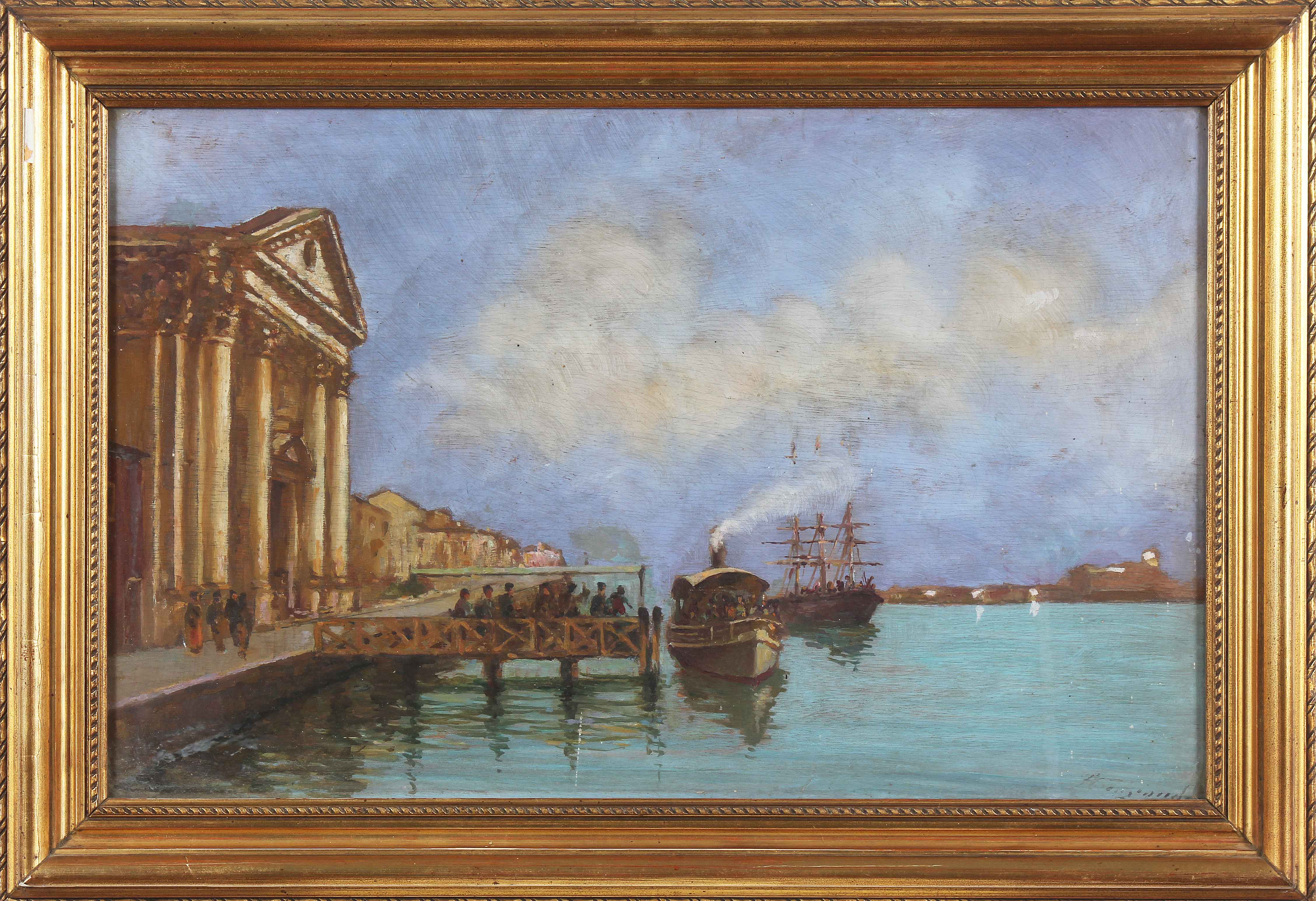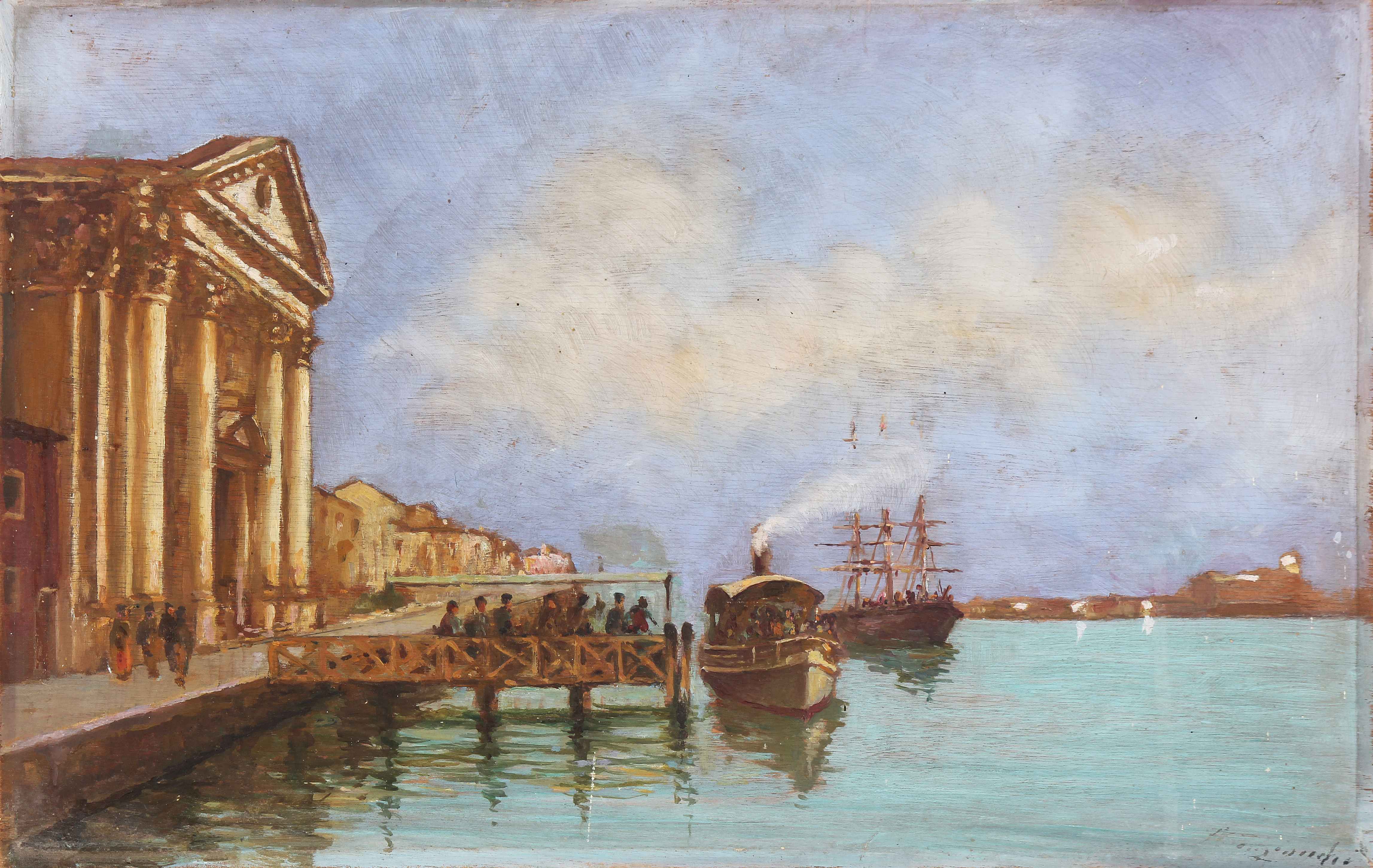 Lot 68 | BIANCHI ARTURO (1856 - 1939) Veduta di Venezia con vaporetto al pontile. Olio...
