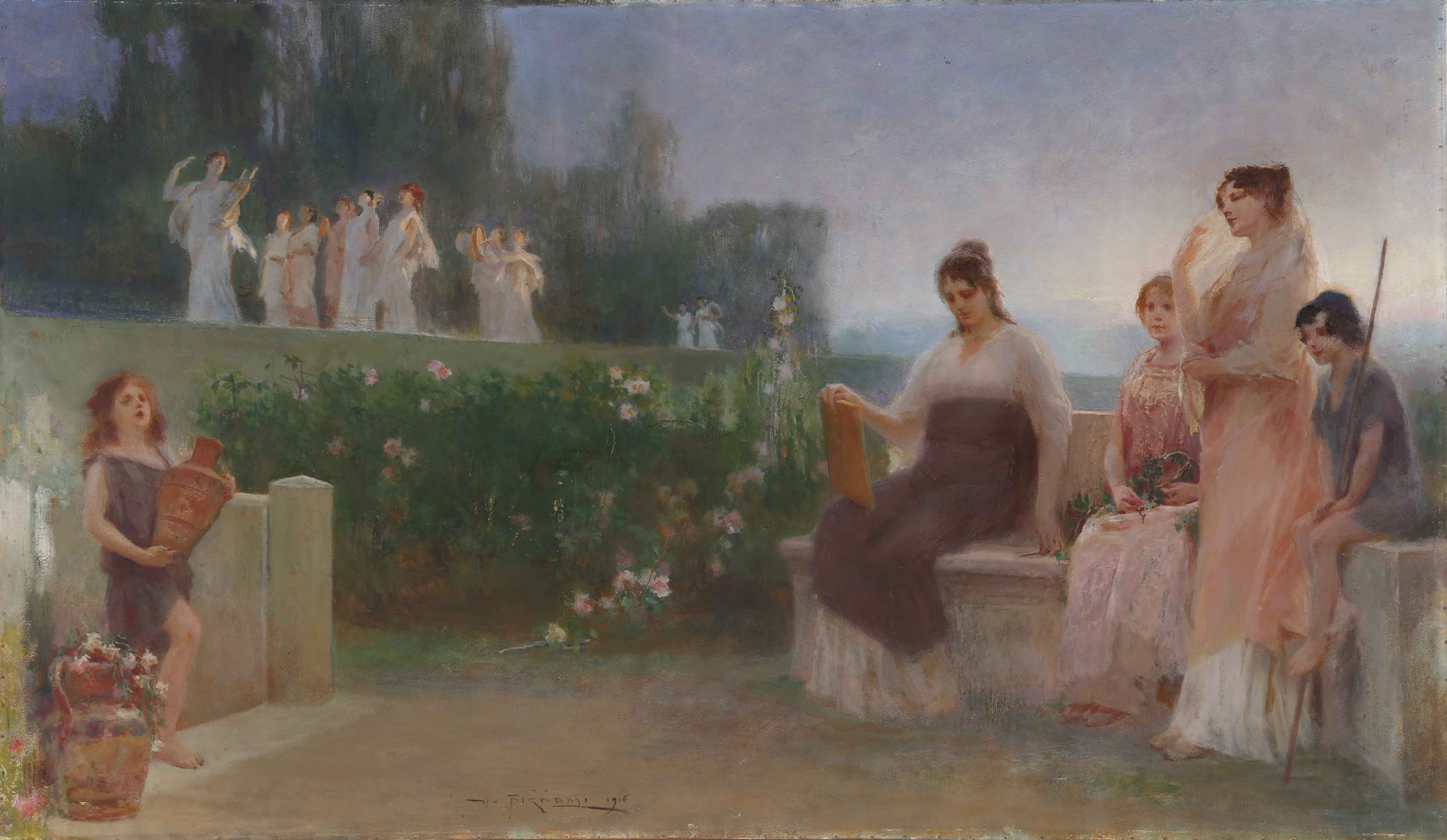BIGNAMI VESPASIANO (1841 - 1929) Il corteo delle Muse. 1916. pastello su cartone pressato. Cm 132,00 x 78,00. Firma in basso al centro e datato 1916. Vespasiano Bignami studiò all'Accademia Carrara di Bergamo, alliedo di Enrico Scuri. Nel 1861 passò da Bergamo a Milano dove divenne uno degli animatori della Famiglia Artistica, associazione che avrebbe avuto larga fortuna in città e si sarebbe posta come alternativa all'Accademia di Brera nella promozione di giovani artisti. Dal 1893 al 1921 insegnò quindi all'Accademia di Brera. Fu abile ritrattista e ricercato in Italia e all'estero come decoratore. Pittore che si incontra raramente sul mercato. BIGNAMI VESPASIANO (1841 - 1929) The Procession of the Muses. Pastel on cardboard "Signature in the lower centre dated 1916.