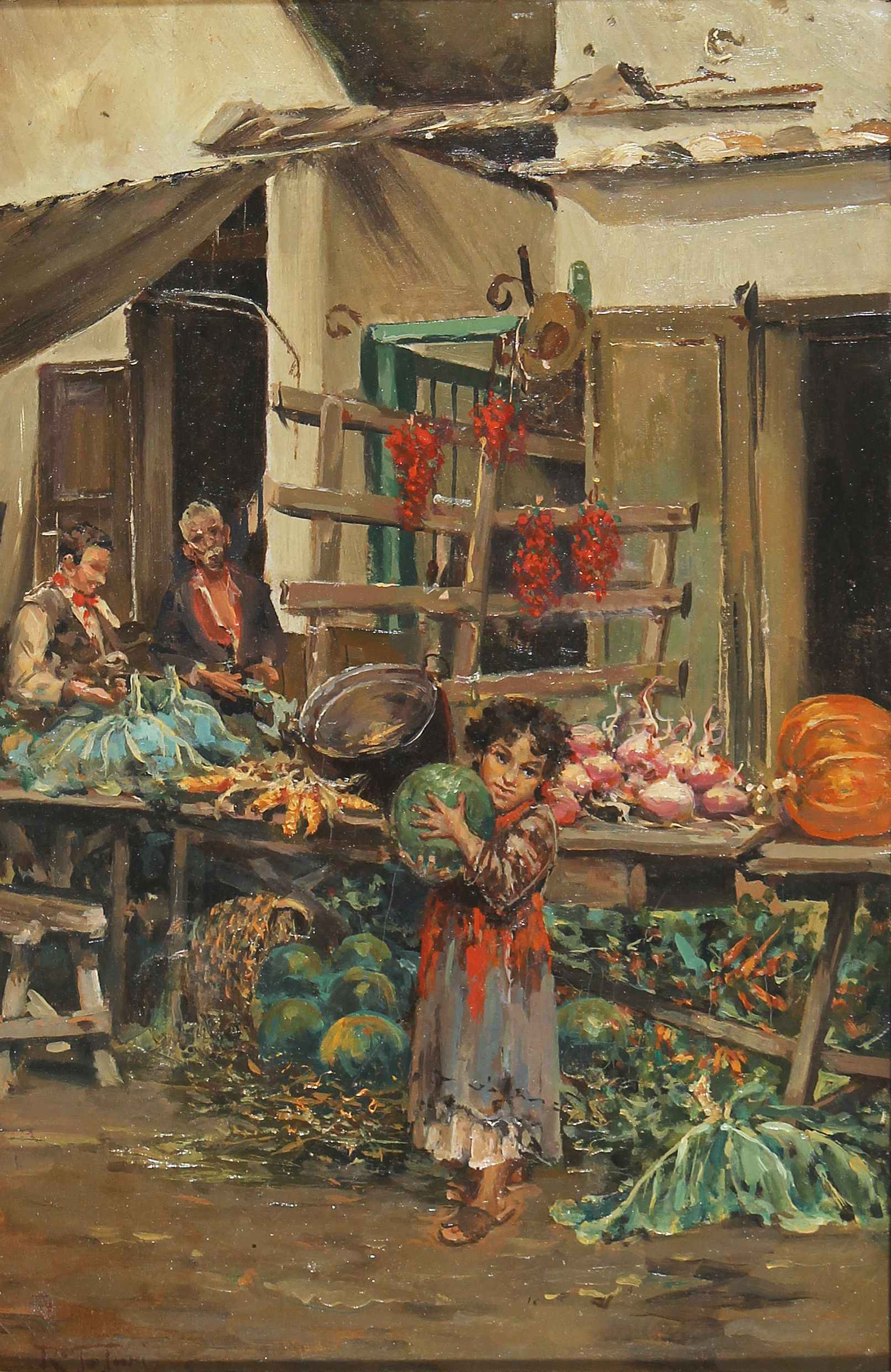 TAFURI RAFFAELE (1857 - 1929) Bambina al mercato. Olio su tela . Cm 21,00 x 32,00. Firma in basso a sinistra. TAFURI RAFFAELE (1857 - 1929) Little Girl at the Market. Oil on canvas Signature on the bottom left. 21,00 x 32,00 cm. Cornice presente