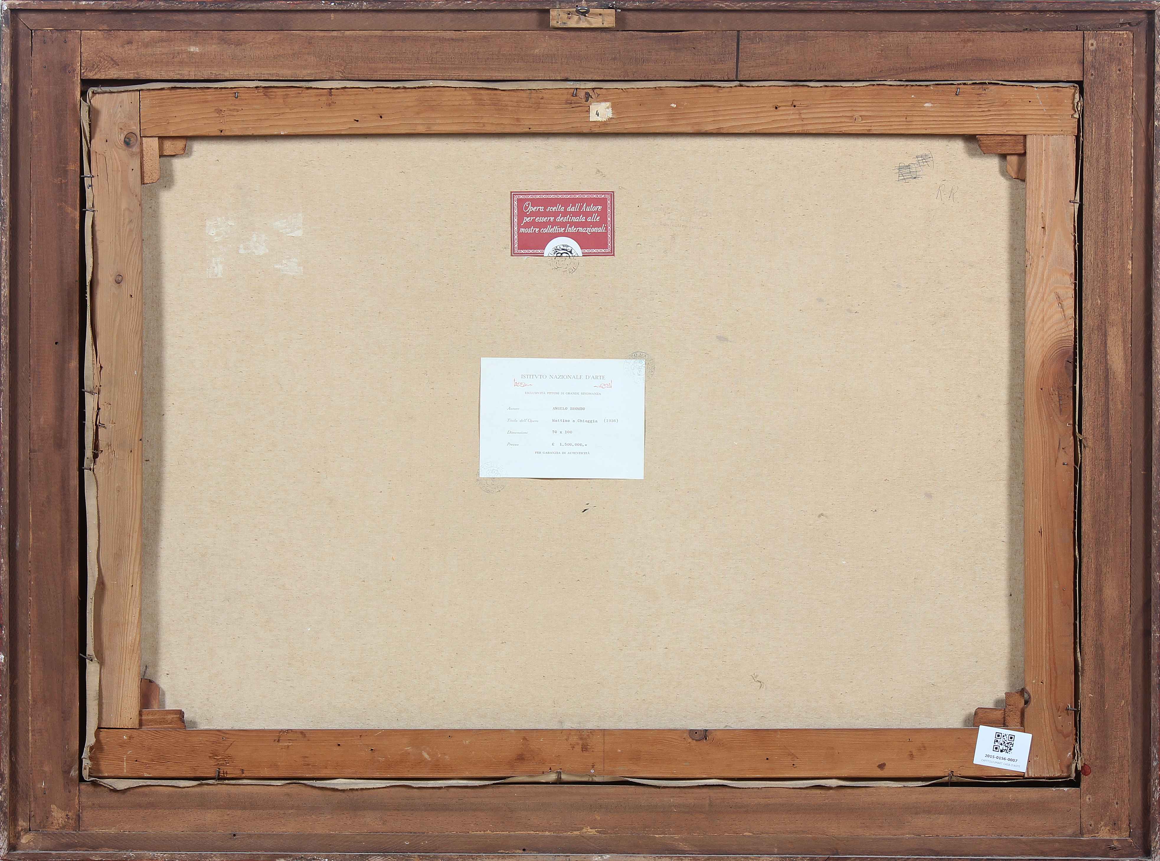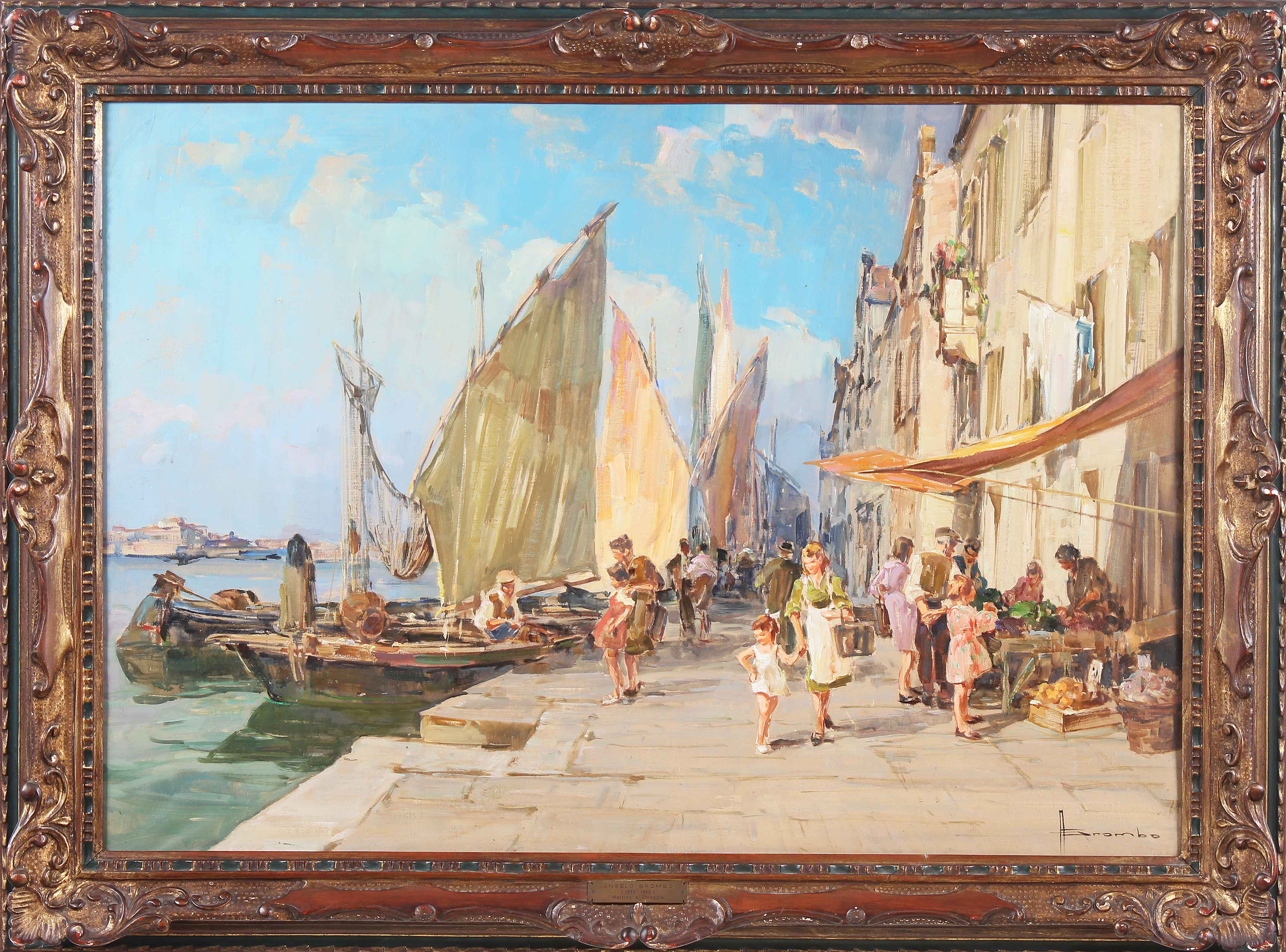 BROMBO ANGELO (1893 - 1962) Mattino a Chioggia. 1936. Olio su tela . Cm 100,00 x 70,00. Firma in basso a destra. Al retro certificato di garanzia a cura dell'Istituto Nazionale d'Arte. BROMBO ANGELO (1893 - 1962) Morning in Chioggia. Oil on canvas Signature on the bottom right. A guarantee certificate from the Istituto Nazionale d'Arte is on the back. 100,00 x 70,00 cm. Cornice presente