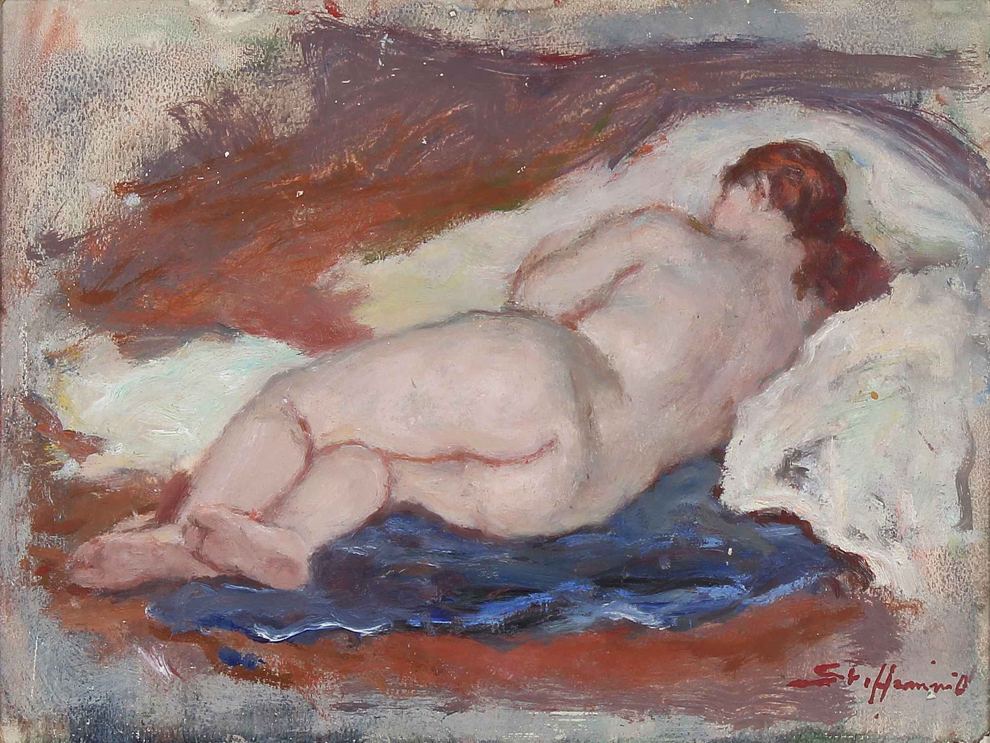 STEFFENINI OTTAVIO (1889 - 1971) Nudo di Donna. Olio su tela . Cm 40,00 x 30,00. firmato in basso a destra. Al retro cartiglio della Galleria Ponte Rosso, Milano. STEFFENINI OTTAVIO (1889 - 1971) Female Nude. Oil on canvas Signed on the lower right. Cartouche of the Galleria Ponte Rosso, Milan, on the back. 40,00 x 30,00 cm. . Cornice presente