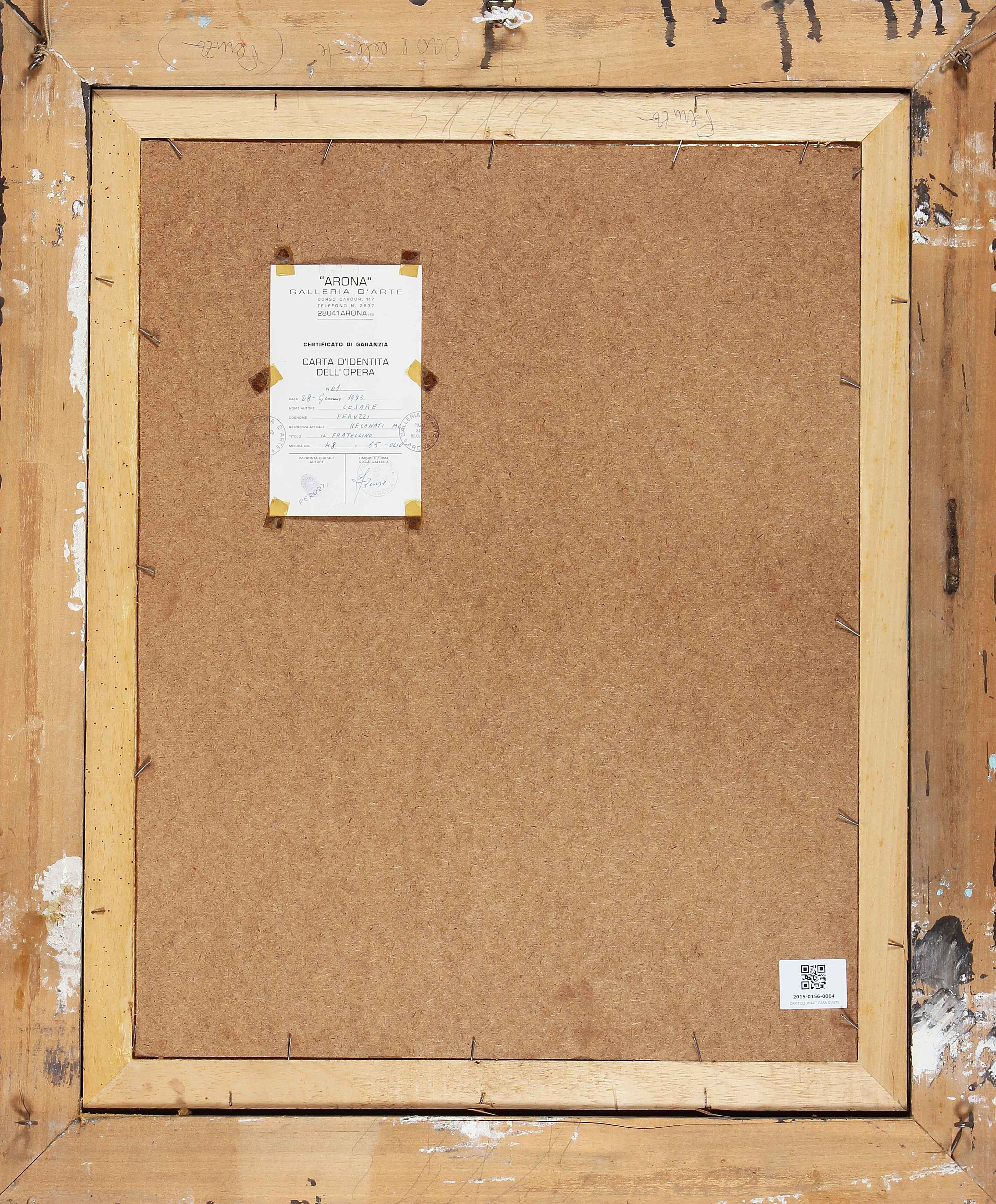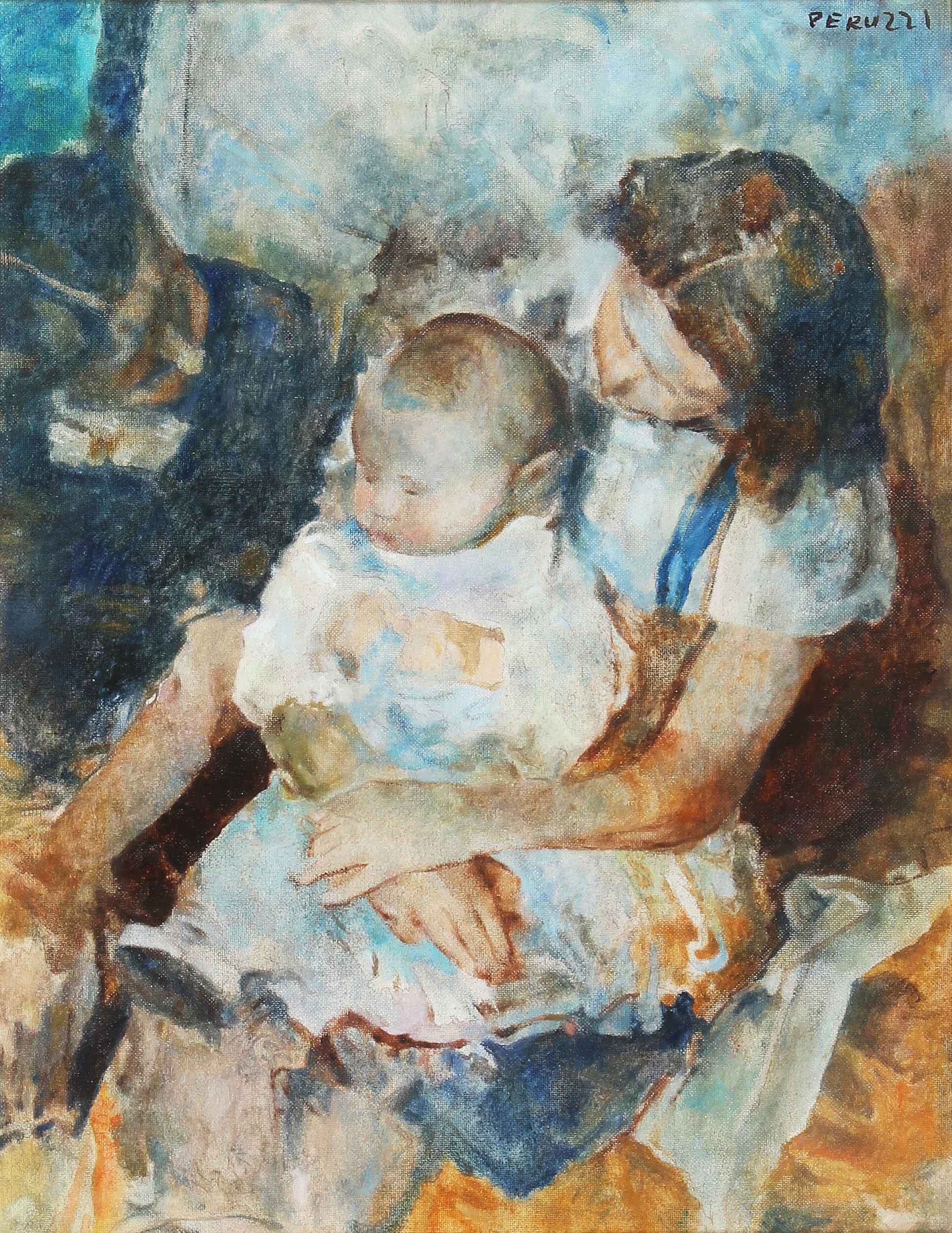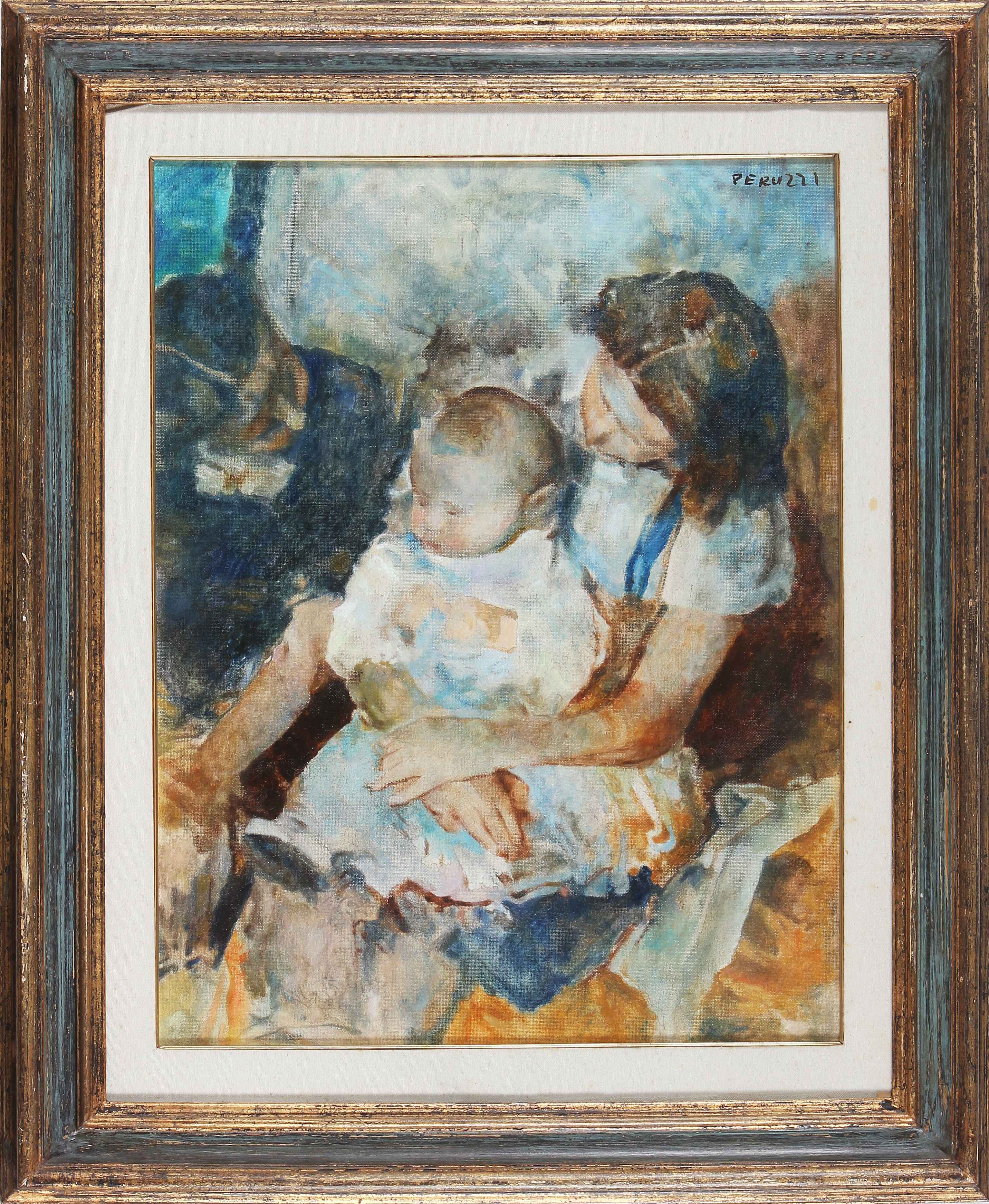 PERUZZI CESARE (1894 - 1995) Il fratellino. Olio su tavola. Cm 56,00 x 70,00. Firma in alto a destra. Al certo certificato di garanzia e timbro a cura della Galleria d'Arte Arona, Arona (No). PERUZZI CESARE (1894 - 1995) The Little Brother. Oil on panel Signature on the top right. Certified by a certificate of guarantee and stamp by the Galleria d'Arte Arona, Arona (No). 56,00 x 70,00 cm. . Cornice presente