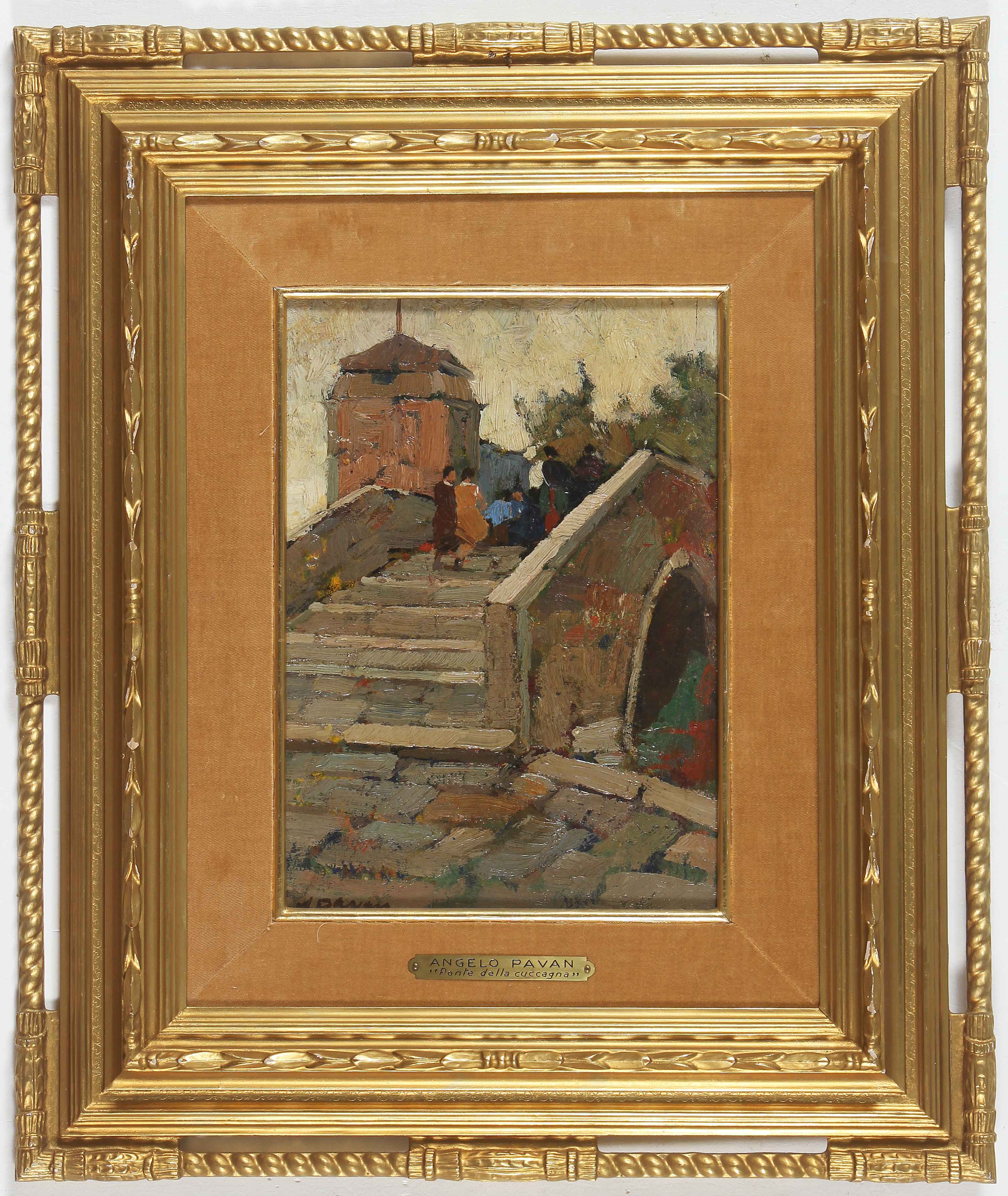 PAVAN ANGELO (1893 - 1945) Ponte della Cuccagna. Olio su tavola. Cm 20,00 x 28,00. Firma in basso a sinistra. PAVAN ANGELO (1893 - 1945) Ponte della Cuccagna. Oil on panel Signature on the bottom left. 20,00 x 28,00 cm. . Cornice presente