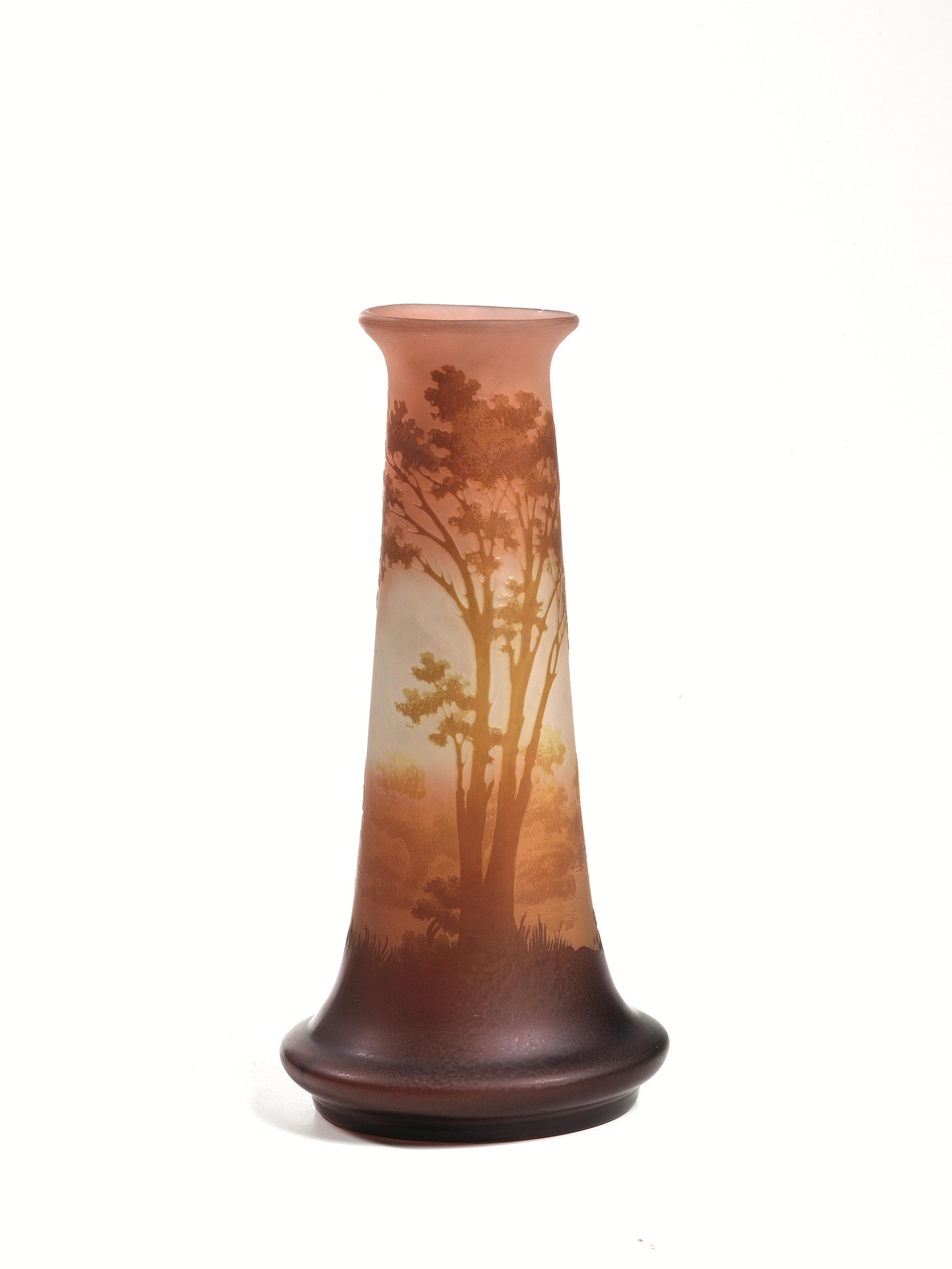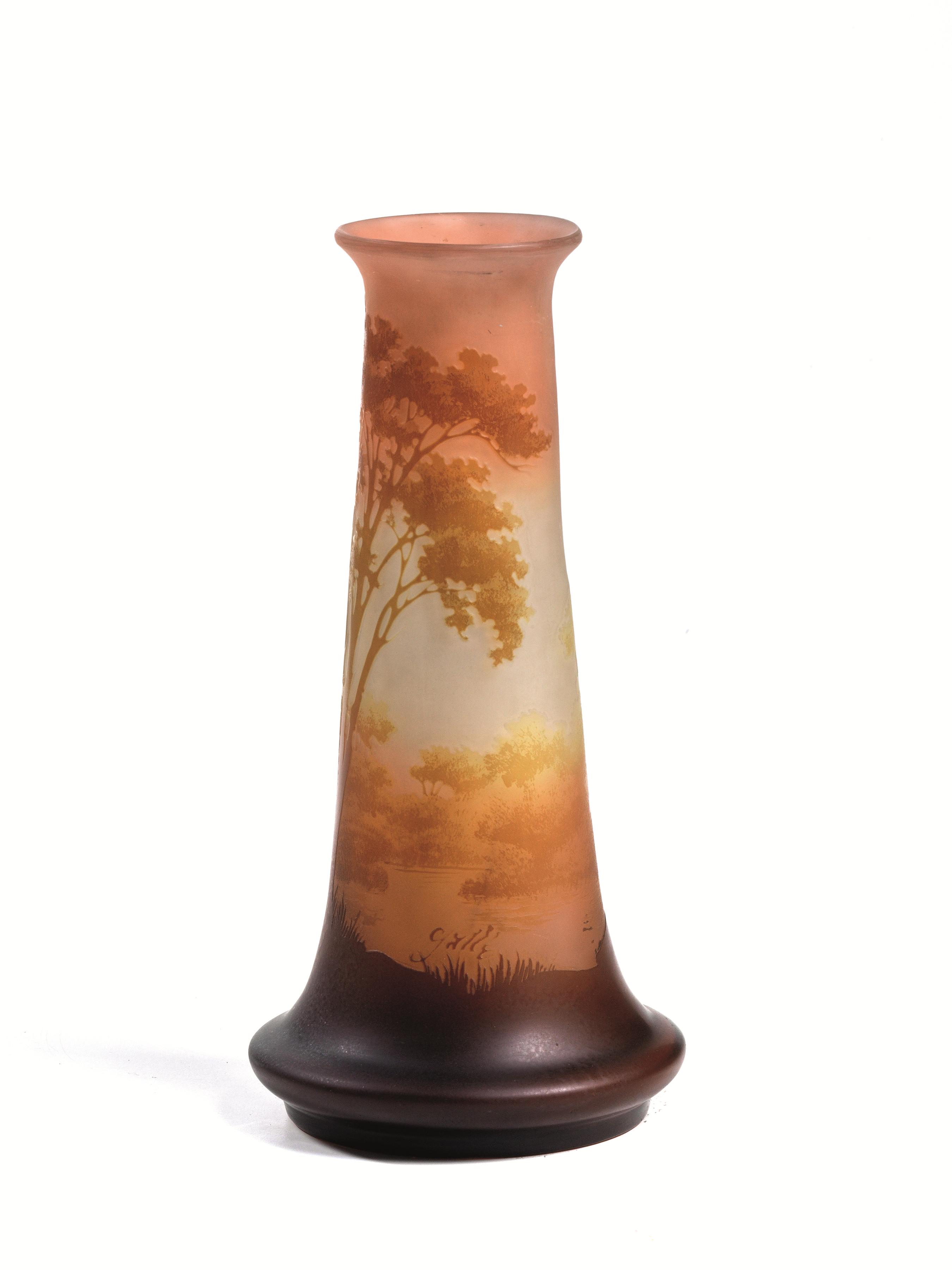in vetro lavorato all'acido con decoro a paesaggio lacustre, alt. cm 24,5.