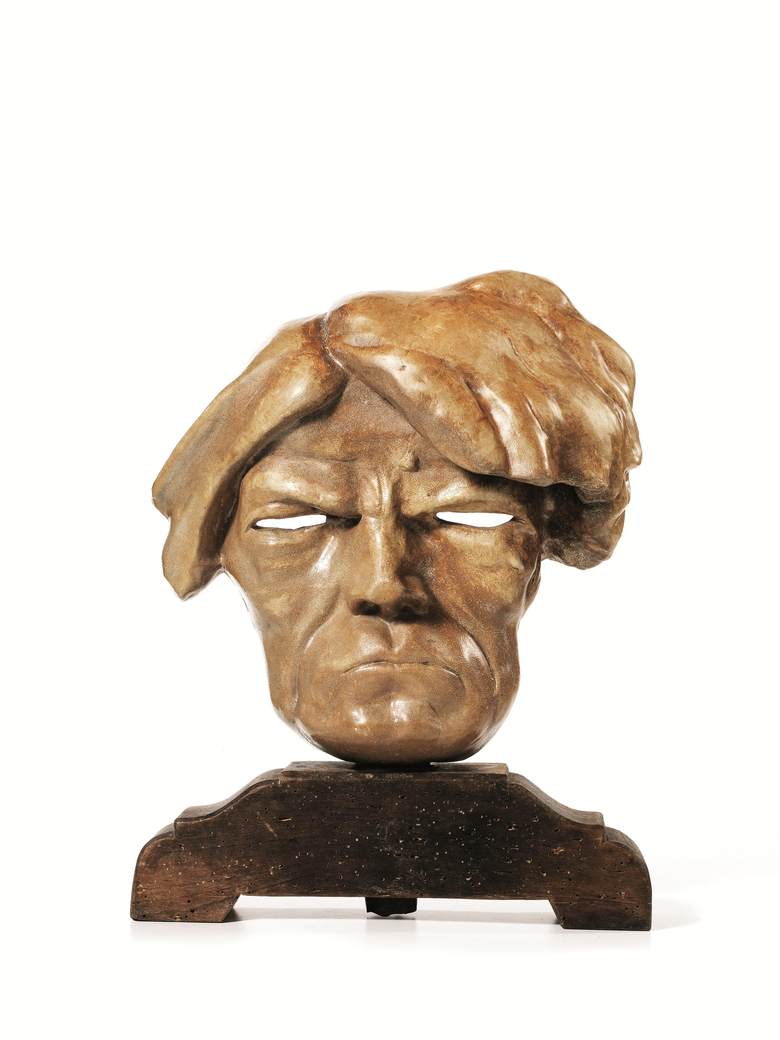 maschera in maiolica a lustro metallico su base lignea.