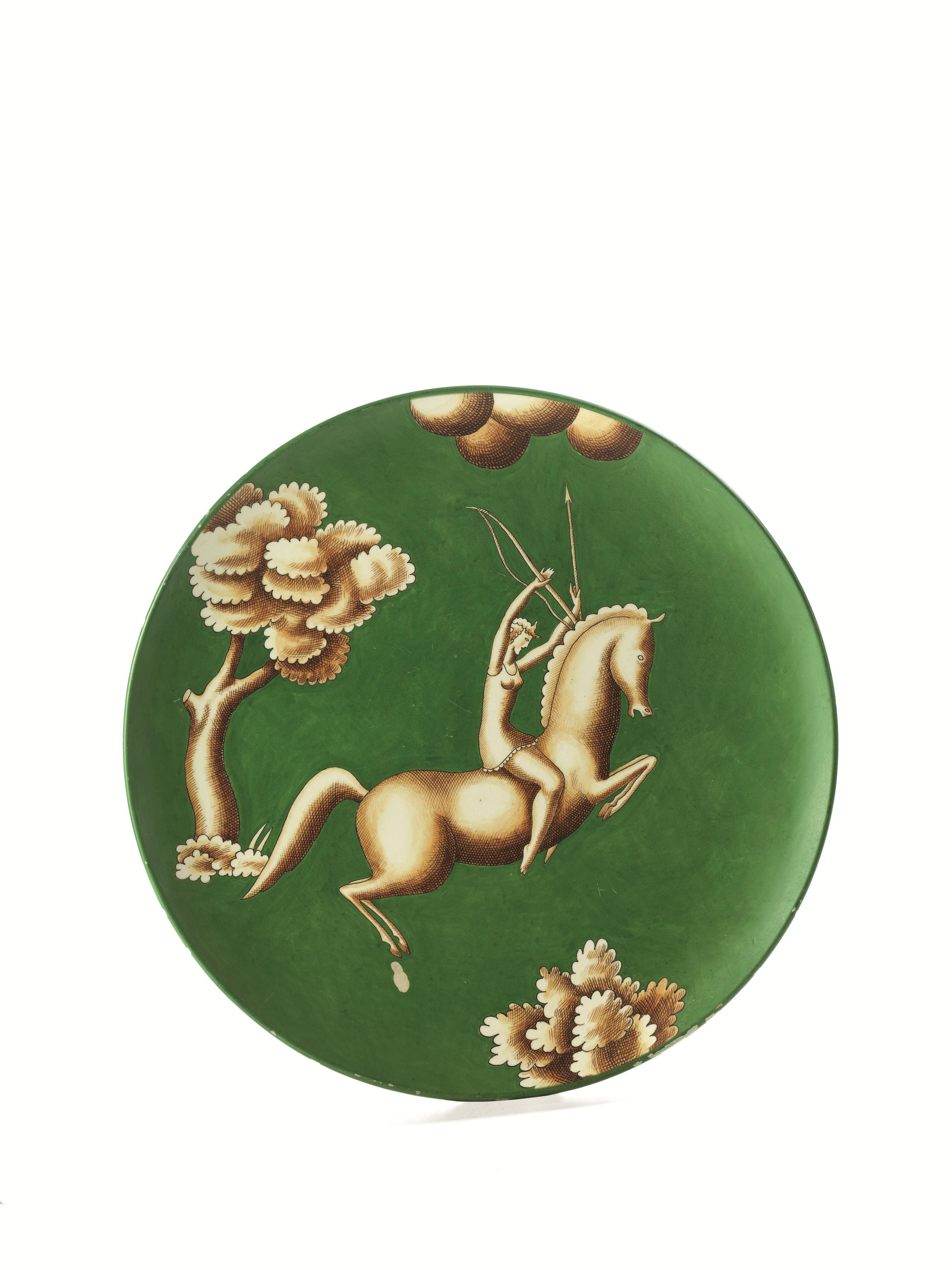Piatto in maiolica con fondo verde e decorazioni in giallo-bruno. Al centro