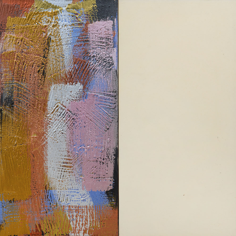 dittico, tecnica mista su 2 tele cm. 117x59 cadauna, totale cm. 117x118x3,8; firma, titolo e anno in alto al retro di entrambe le tele, opera priva di cornice.
