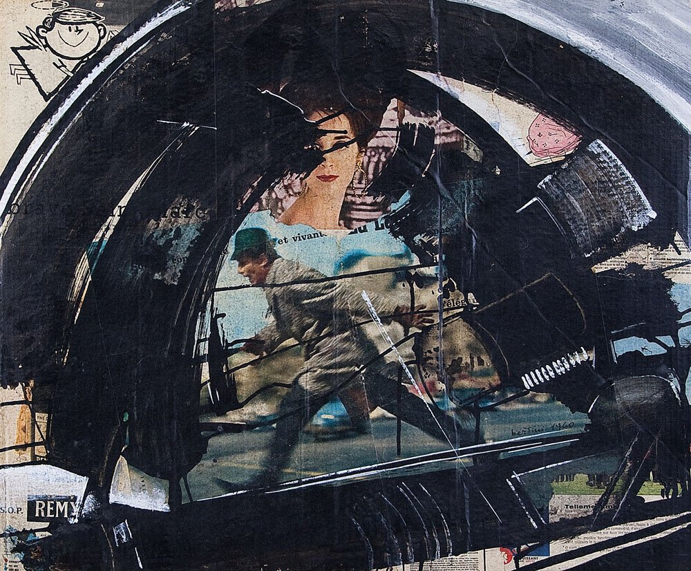 olio e collage su cartone intelaiato cm. 60x74, firma e anno in basso a destra, firma, titolo, anno (parzialmente coperti dal telaio) ed etichetta della Galleria Annunciata (MI) al retro del dipinto, etichetta della Galleria Colossi Arte Contemporanea (Chiari-BS) al retro della cornice, dichiarazione d'autenticità dell'artista, timbro e firma della Galleria Annunciata (MI) su foto.