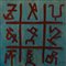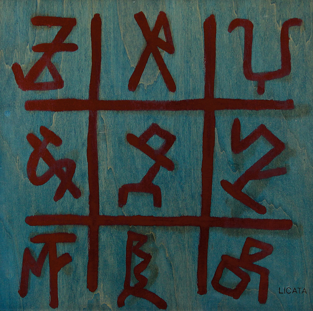 smalti su tavola di legno di pino nostrano cm. 70x70, firma incisa in basso a destra, elemento inferiore dell'omonima installazione composta da quattro elementi più supporto, dichiarazione d'autenticità dell'artista su foto.