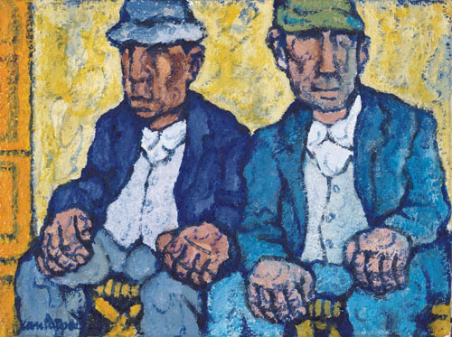 DOMENICO CANTATORE Ruvo Di Puglia (Ba) 16/03/1906 - Parigi 22/05/1998 Uomini del Sud olio su tela cm. 30x40, firma in basso a sinistra, dichiarazione d'autenticità dell'artista su foto.