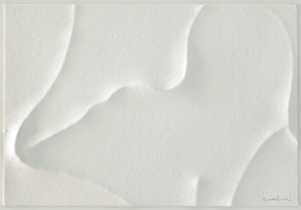 rilievo su carta cm. 16x23 applicata su cartone cm 35x43, firma in basso a destra, etichetta e timbri della Galleria Schiapparelli Arte (Biella) al retro, dichiarazione d'autenticità dell'artista e archivio Bonalumi (Galleria Fumagalli) su foto, entro teca in plexiglass.