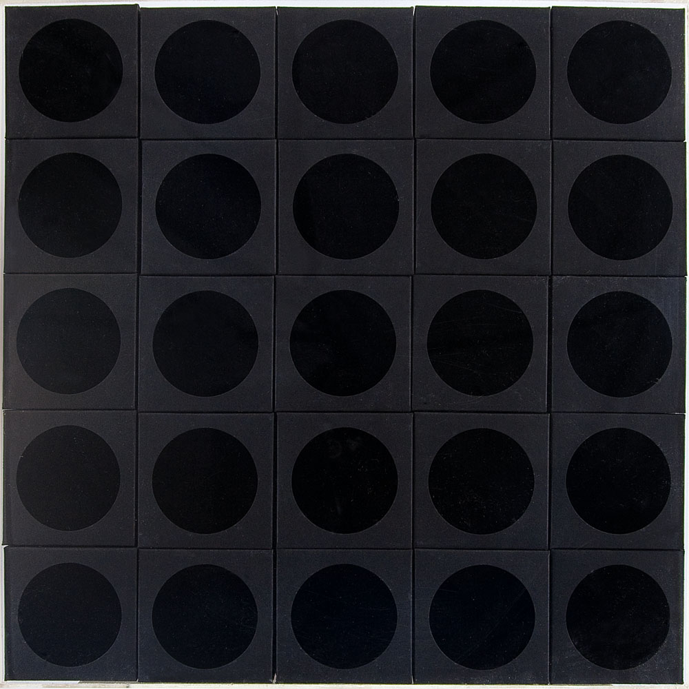 cartoni fustellati cm. 52x52x11, base quadrata, modulo 5, taglio semplice diagonale unidirezionale, opera non firmata, etichetta della Galleria d'Arte del Naviglio al retro, entro teca in plexiglass, la parte posteriore del plexiglass presenta una rottura nell'angolo.