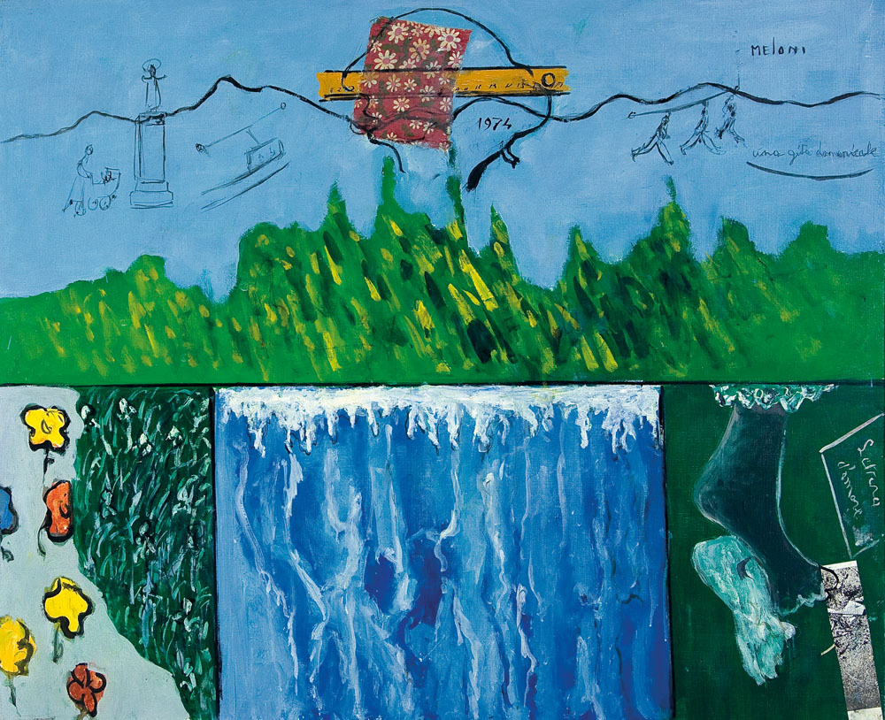 olio e collage su tela cm. 72x93, firma in alto a destra, titolo, firma, anno ed etichetta della Galleria Delle Ore (MI) al retro.
