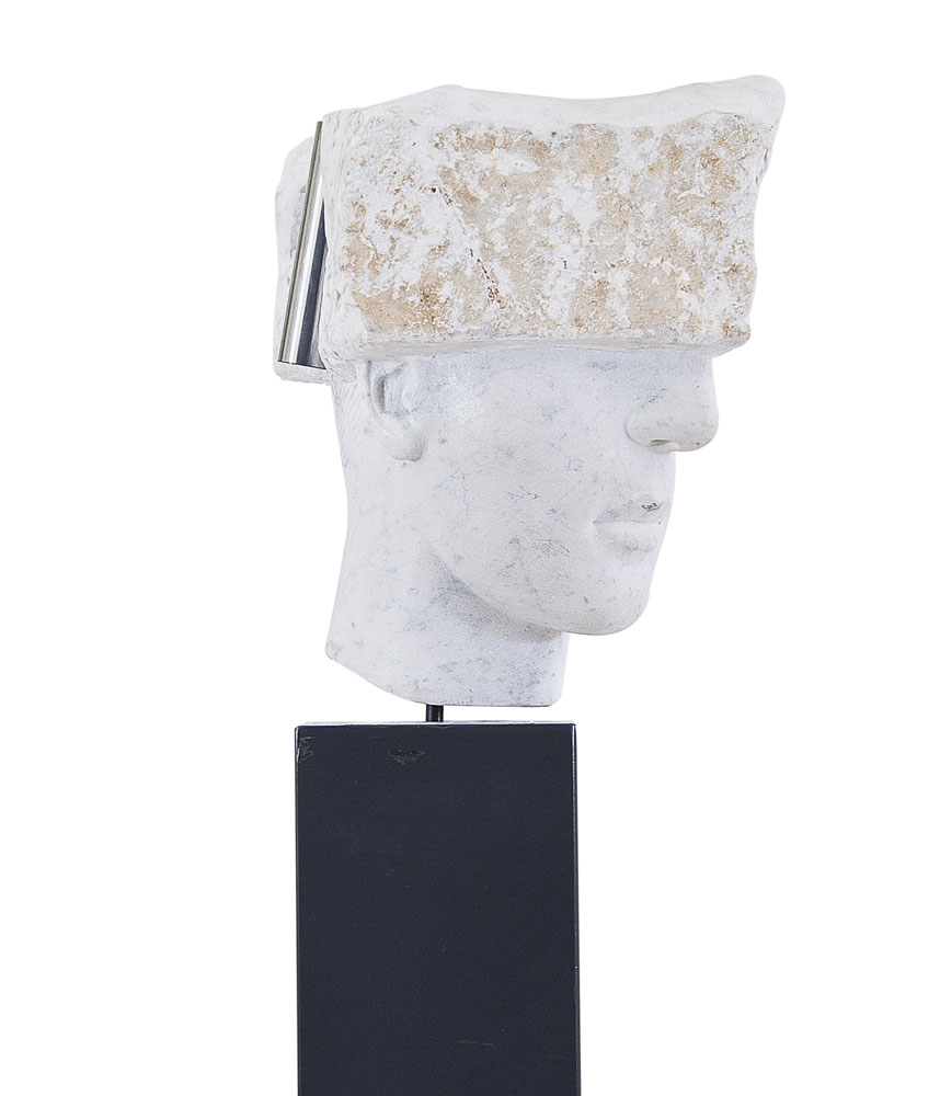 scultura in marmo bianco cm. 22x28x32 dimensioni con base in ferro verniciato cm. 30x30x154, opera non firmata, dichiarazione d'autenticità dell'artista su due foto.