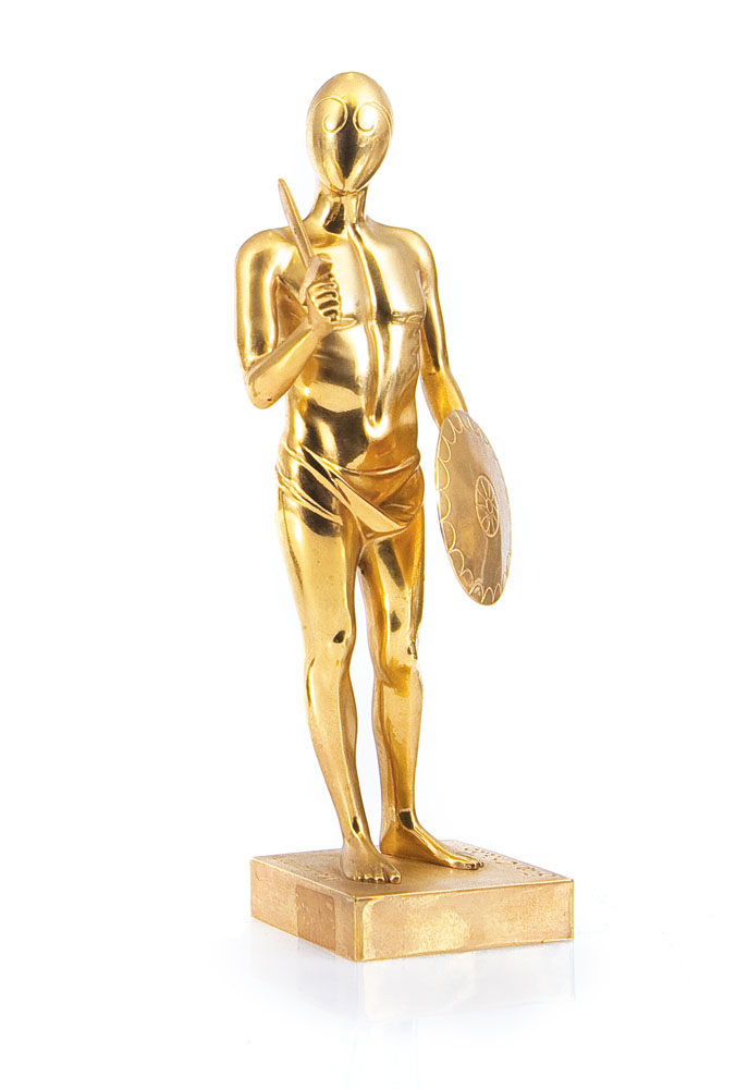 scultura in bronzo dorato cm. 31x9x7,5; esemplare XLIV/100, firma, titolo e tiratura incisi alla base, edizione realizzata nel 1998 dalla Fonderia Bonvicini (Sommacampagna-VR) su autorizzazione della Vedova Isa De Chirico, certificato di garanzia della Fondazione Giorgio e Isa De Chirico e timbro della Fonderia F.lli Bonvicini su foto.