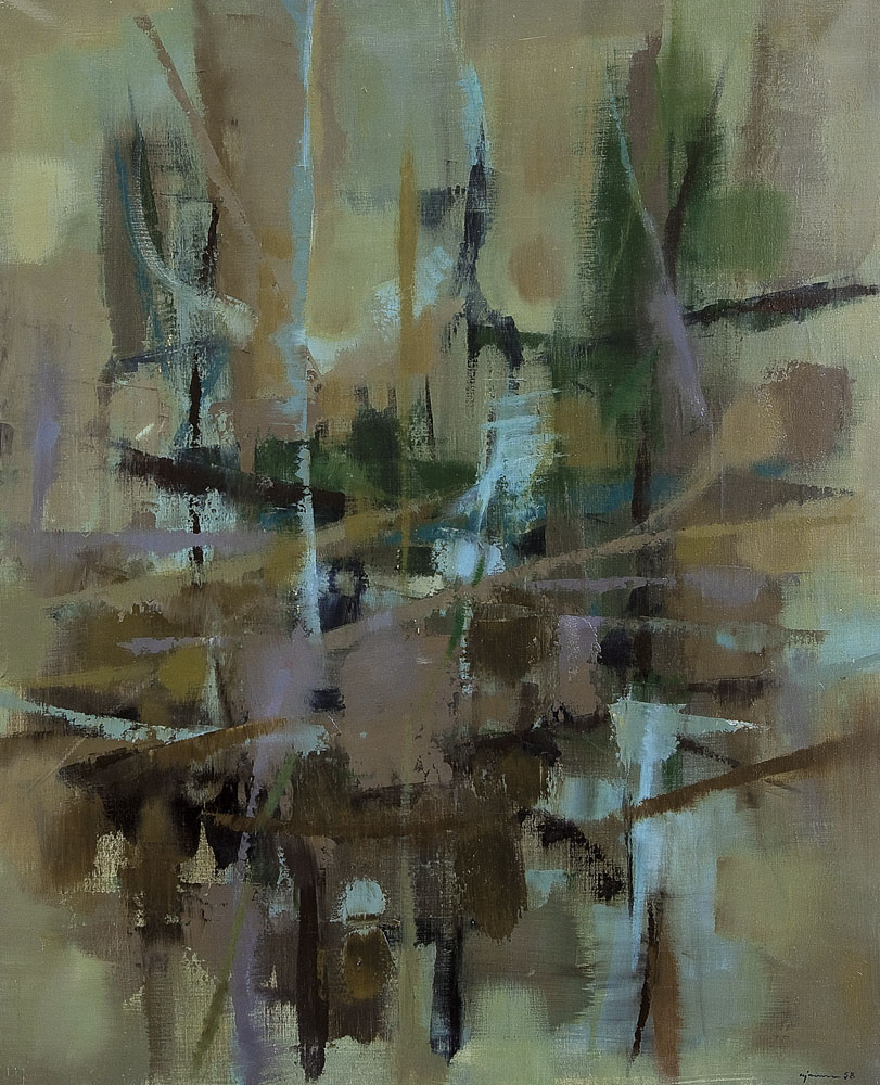 olio su tela cm. 92x73, firma e anno in basso a destra, titolo, anno e dichiarazione d'acquisto datata 1958 al retro, dichiarazione d'autenticità dell'artista su foto, opera registrata presso l'Archivio Giuseppe Ajmone come da dichiarazione su foto.