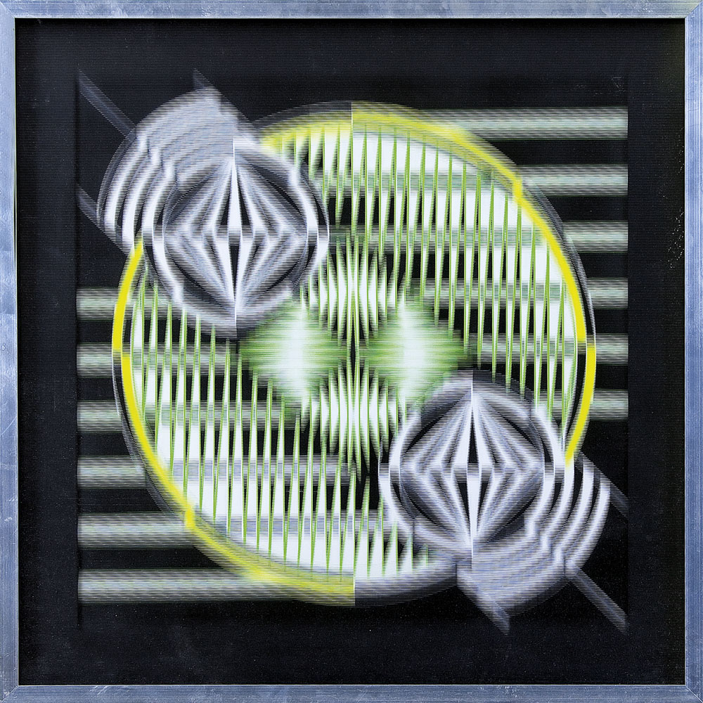 tecnica mista su cartoncino con copertura in plexiglass zigrinato a linee orizzontali cm. 60x60, firma, anno, etichetta e timbri dell'artista al retro, dichiarazione d'autenticità dell'artista e timbro della Anti: galleria d'Arte (Mestre-VE) su certificato allegato.