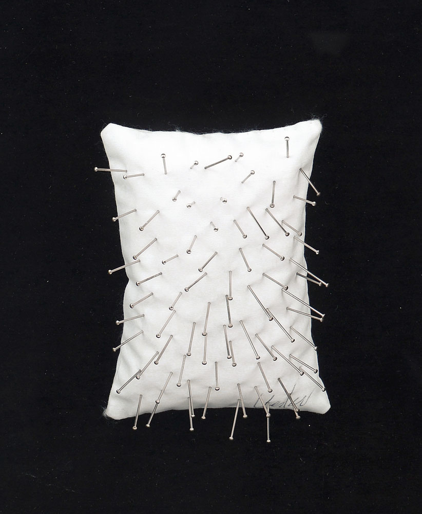 spilloni su puntaspilli cm. 14x10x4 applicato su tavola cm. 25x20, firma in basso a destra, provenienza Kuhn Galerie (Achen), omaggio a Achim Von Armin e Clemens Von Brentano (1969), edizione di 200 esemplari (cuscino) con spilloni inseriti dall'artista in maniera casuale e diversa per ogni pezzo, timbro e firma per autenticità e provenienza della Galleria d'Arte Roggia Grande (TN) su certificato allegato, entro teca in legno di cm. 41x37x9,5.