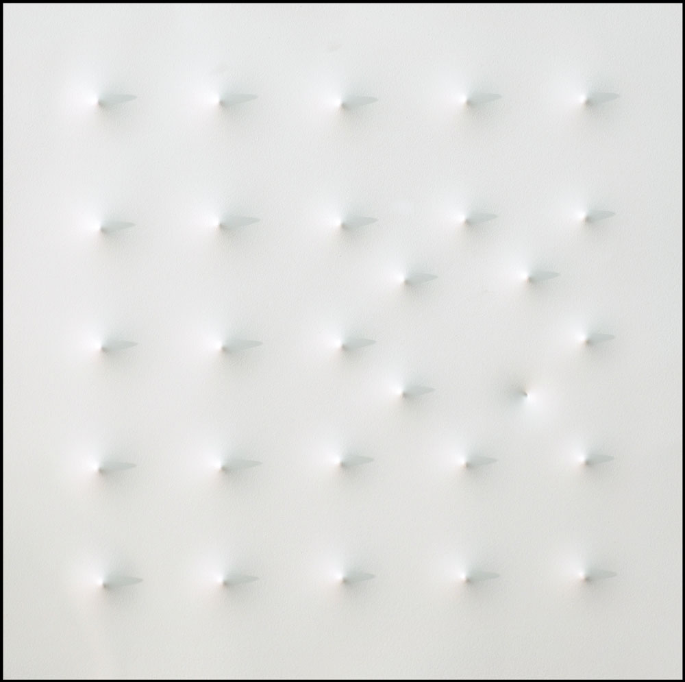 spari di pistola cal. 5,56 su lastra in alluminio (colore bianco) cm. 40x40, firma e tecnica al retro, dichiarazione d'autenticità dell'artista su foto.