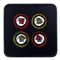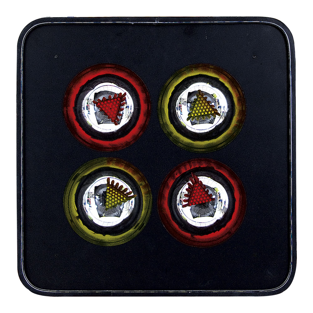 assemblaggio di materie plastiche, 4 semisfere e legno cm. 40x40x8, firma, titolo e anno al retro, dichiarazione d'autenticità dell'artista su foto, dichiarazione d'autenticità dell'artista e timbro della Anti: galleria d'arte contemporanea (Mestre-VE) su foto.