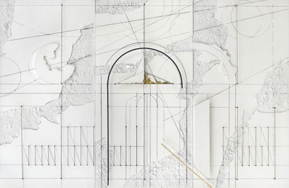 tecnica mista e applicazioni su 3 pannelli in legno cm. 100x50 cadauno, totale cm. 100x150, firma, titolo, anno, archivio n° 69788 ed etichetta dell'artista sul retro del pannello sinistro, dichiarazione d'autenticità e archivio dell'artista su foto, entro teca in plexiglass.