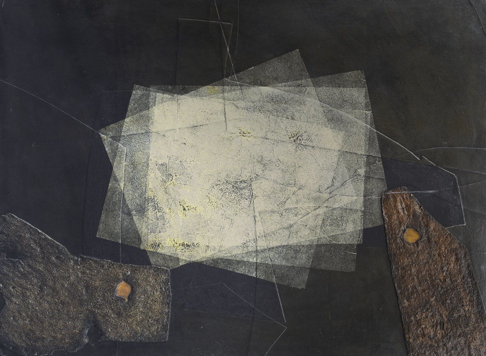 amiantite, tecnica mista e sughero su tavola cm. 87x116, firma, titolo, archivio ADN 0010/07/002 a cura di Roberto Crippa Junior, etichetta della Galleria Schwarz (MI) e timbro di Collezione Privata al retro, dichiarazione d'autenticità e archivio a cura di Roberto Crippa Junior su foto, entro teca in plexiglass.