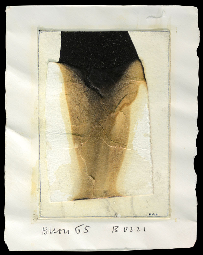 plastica, vinavil e combustione cm. 11,3x8 applicata su cartone cm 14,5x11,5; firma in basso a destra, etichetta della Galleria La Scaletta al retro, opera registrata presso l'Archivio della Fondazione Palazzo Albizzini, Collezione Burri, Città di Castello.