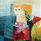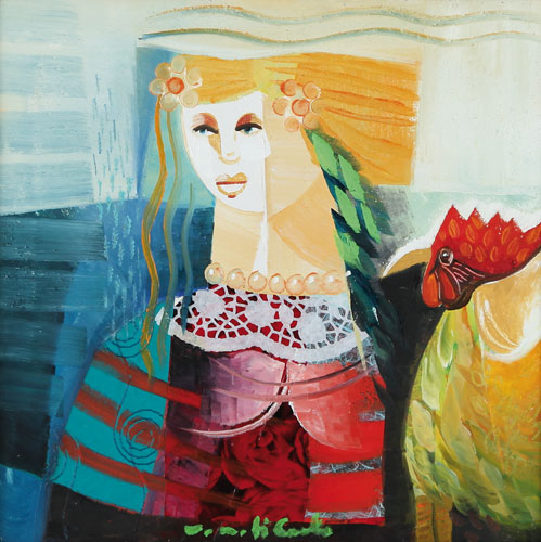 VITTORIOMARIA DI CARLO S. Marco in Lamis (Fg) 1939 Figura con gallo olio e collage su tela cm. 40x40, firma in basso al centro e al retro, dichiarazione d'autenticità e archiviazione dell'artista su foto.