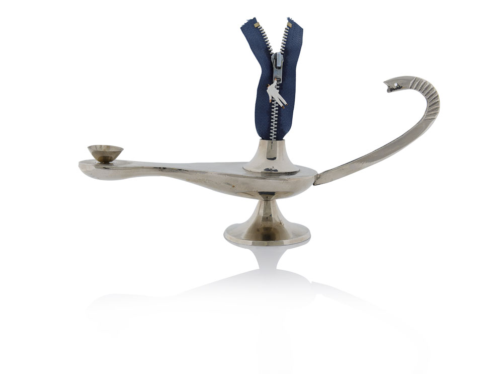 applicazione di plastiche e chiusura lampo su lampada in metallo cm. 15x26x6,5; firma, titolo e anno sotto la base, dichiarazione d'autenticità dell'artista su foto.