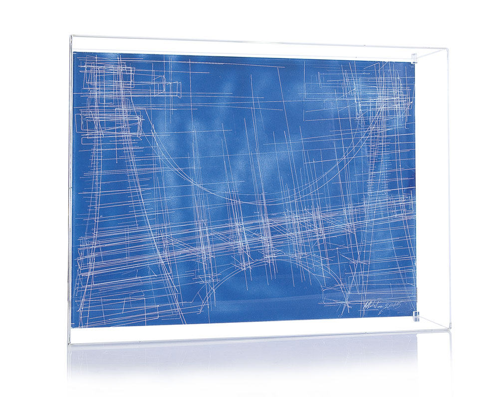 scultura in vetro su fondo blu-grigio cm. 61,5x81,5x16, firma e anno in basso a destra, entro teca in plexiglass, dichiarazione d'autenticità dell'artista su stampa fotografica A4 allegata.