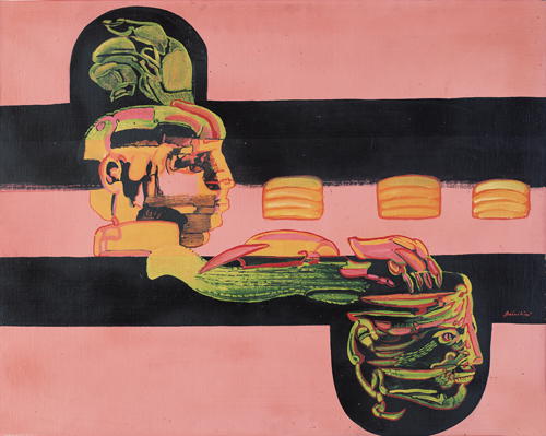 REMO BRINDISI Roma 25/04/1918 - Milano 25/07/1996 Vincitore e vinto, 1974 olio su tela rintelata cm. 73x92, firma in basso a destra, dichiarazione d'autenticità dell'artista al retro, opera registrata presso l'Archivio Remo Brindisi come da dichiarazione su foto.